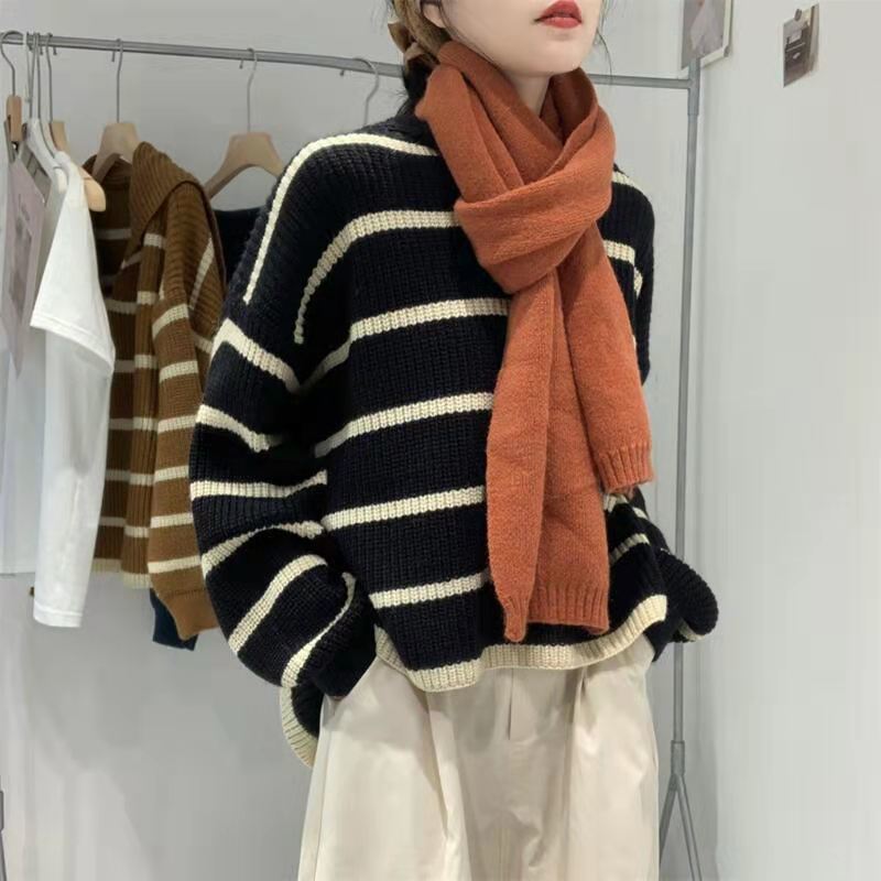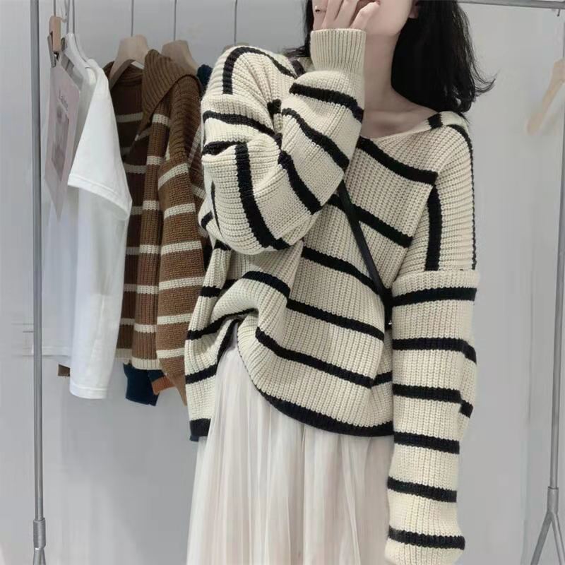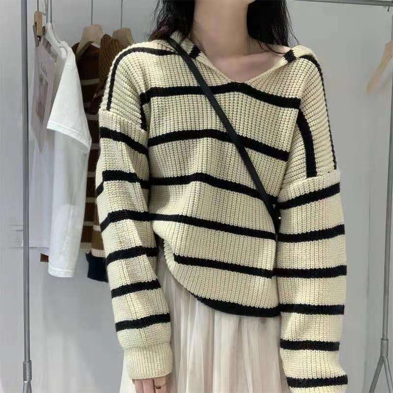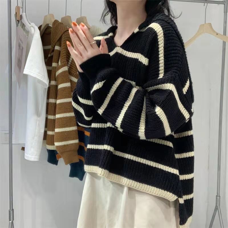 Новый темно-синий свитер с воротником, женский, весна-осень 2022, корейская версия, полосатый пуловер с длинными рукавами, женский повседневный топ
