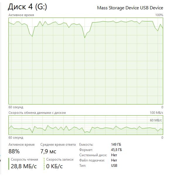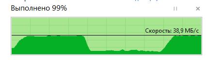 От USB3.0 не работает, нужно подключать только к 2.0. Диск 3.5 дюйма не подключается, ноутбучный 2.5 подключился. Скорости записи и чтения на скриншотах. Чтение 30-50Мб. Запись до 40Мб, хотя треть времени была просадка до 8Мб.