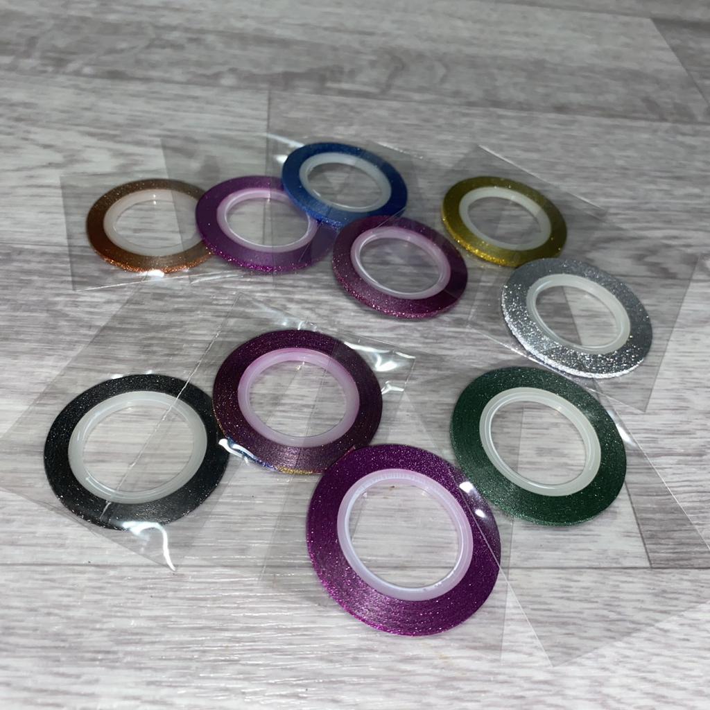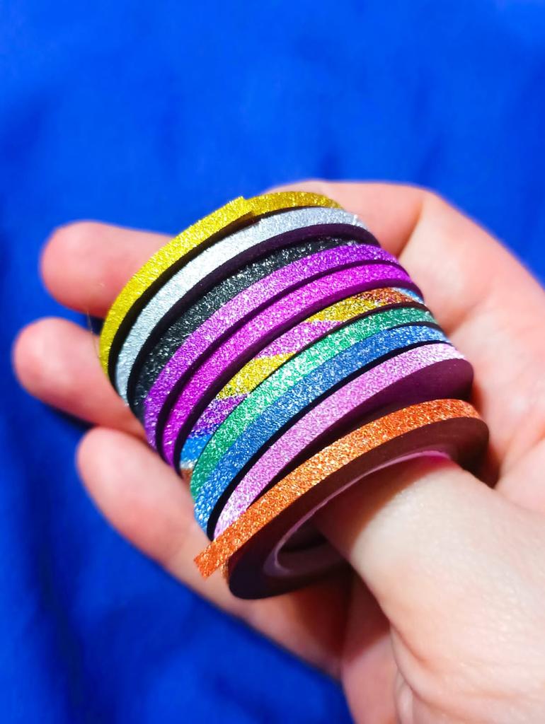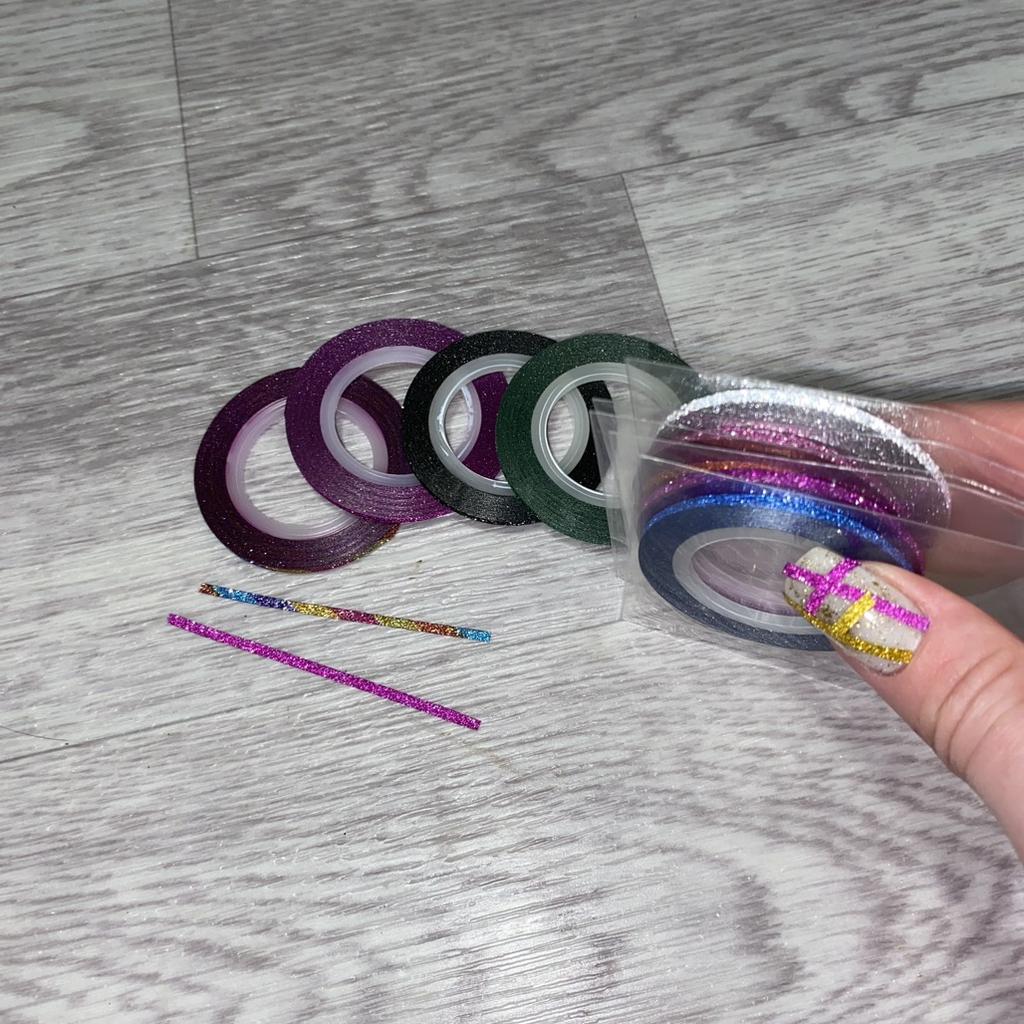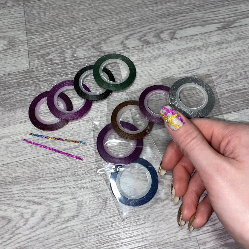 Ленты для маникюра Набор из 10 лент разных цветов Ленты с блестяшкой, к тому же, блестяшка светоотражающая. У меня набор лент с шириной 2мм — это идеальный размер для маникюра 🎉 Так как цветов в наборе много, подойдут под большое количество дизайнов для ногтей. Конечно же, использовать их можно не только для маникюра, а еще для различных поделок своими руками, украшения и дизайна разных вещей 😉 Лента очень тонкая, на ногтях не выделяется практически. Это однозначно плюс 💫 Имеет липкую основу, но ОБЯЗАТЕЛЬНО ЗАКРЕПЛЯТЬ топовым покрытием, или делать укрепление прозрачным гель-лаком поверх наклееных полосочек 😉 Я в восхищении, набор большой, хватит на долго для различных дизайнов ❤️ (я делаю Рекомендую без раздумий ✅