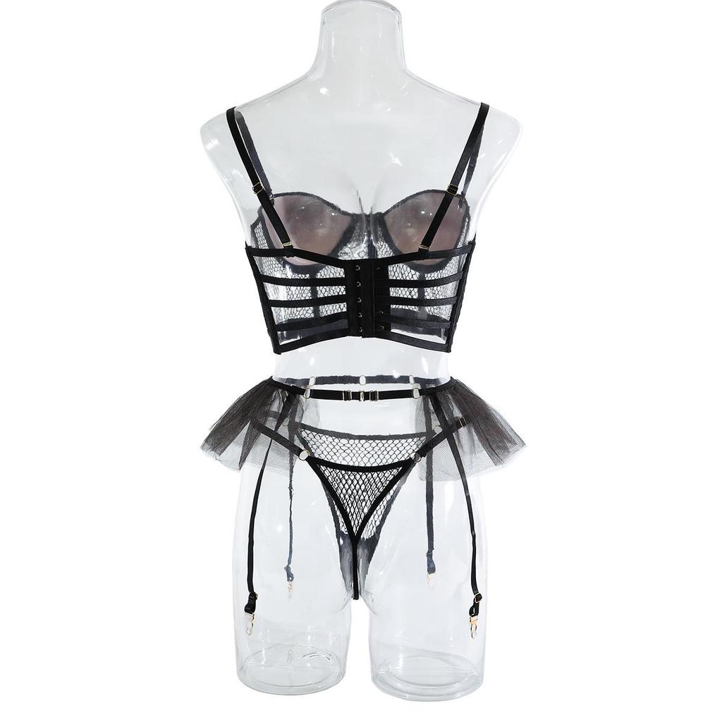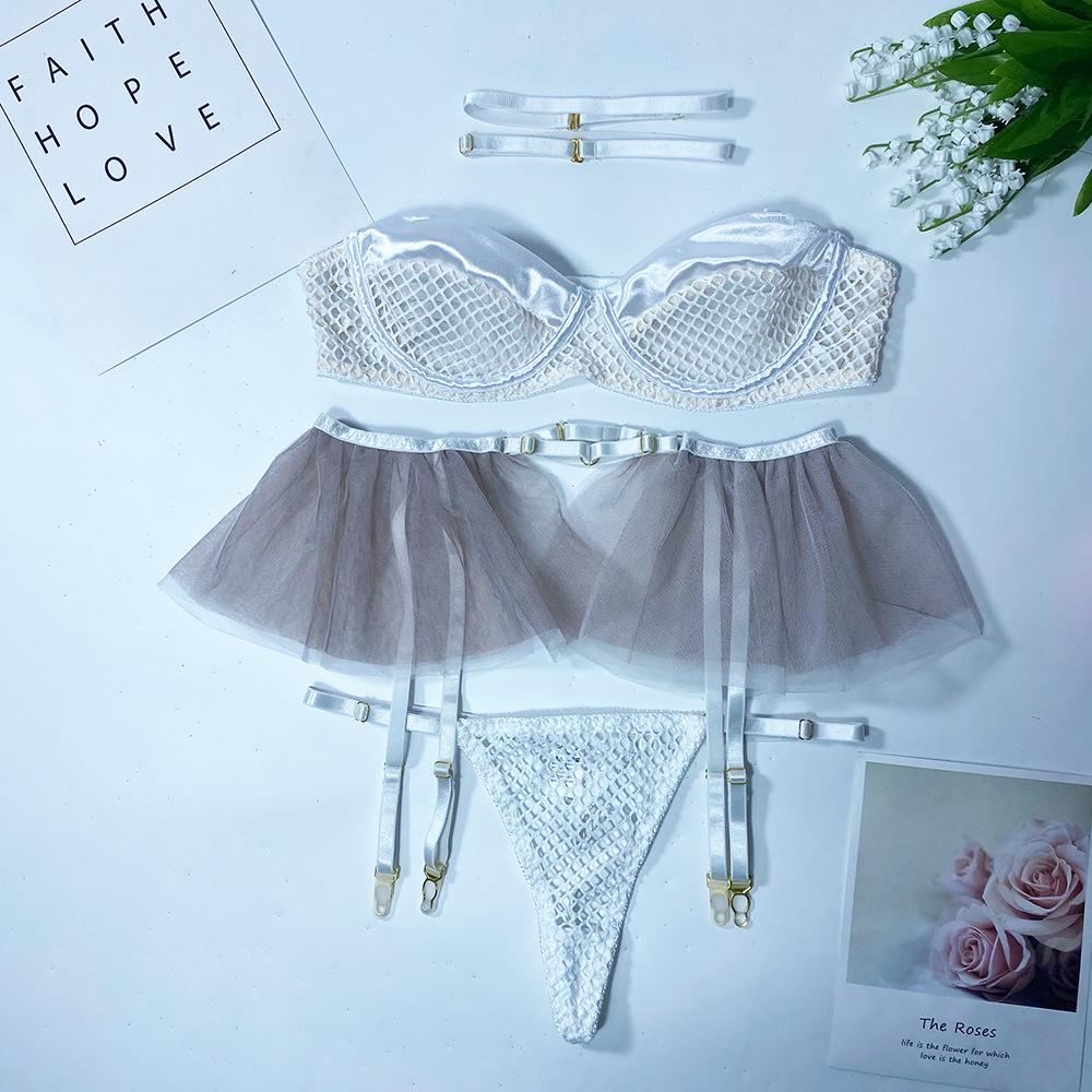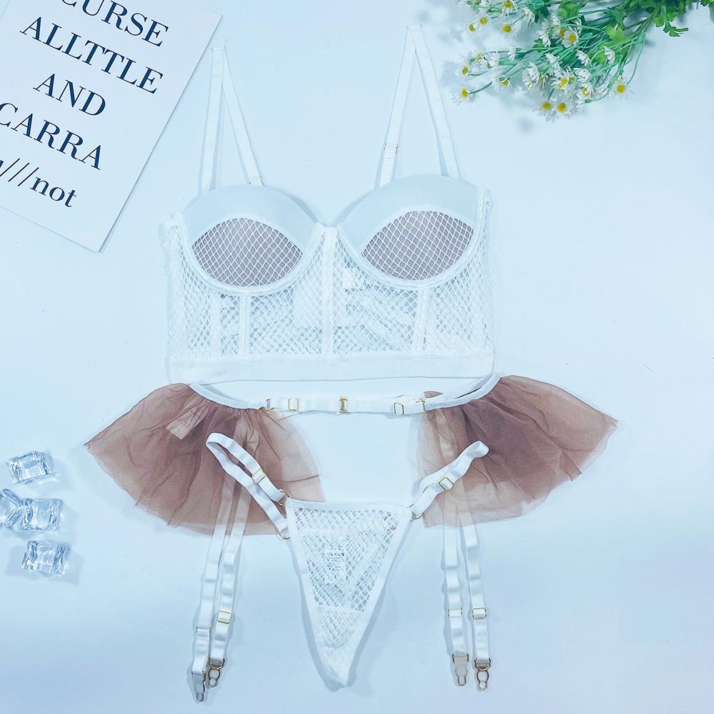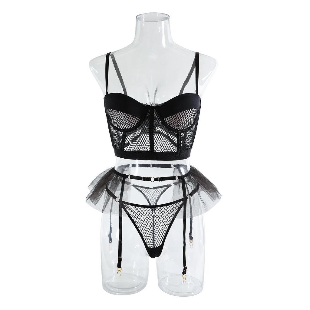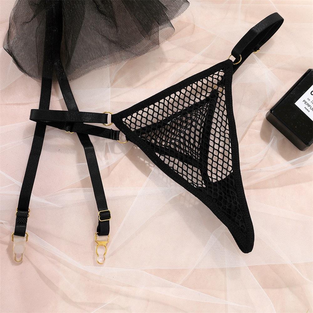 Aduloty Сетчатый полый перспективный летний эротический комплект нижнего белья, женский бюстгальтер на косточках с мягкой подкладкой и тюлевой подвязкой, комплект сексуального нижнего белья