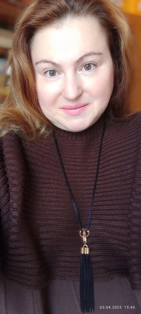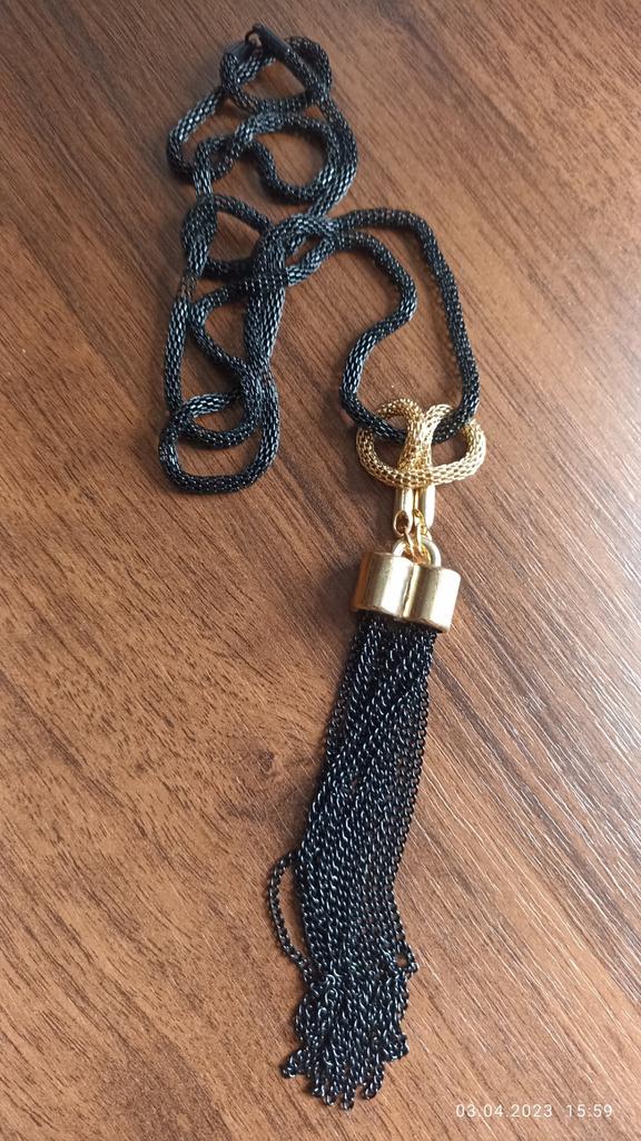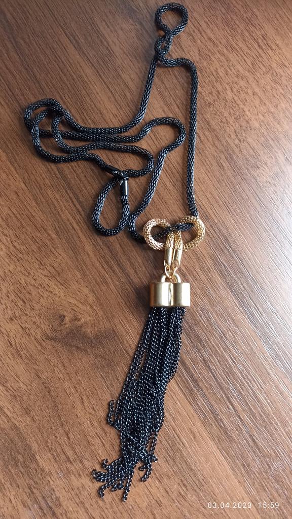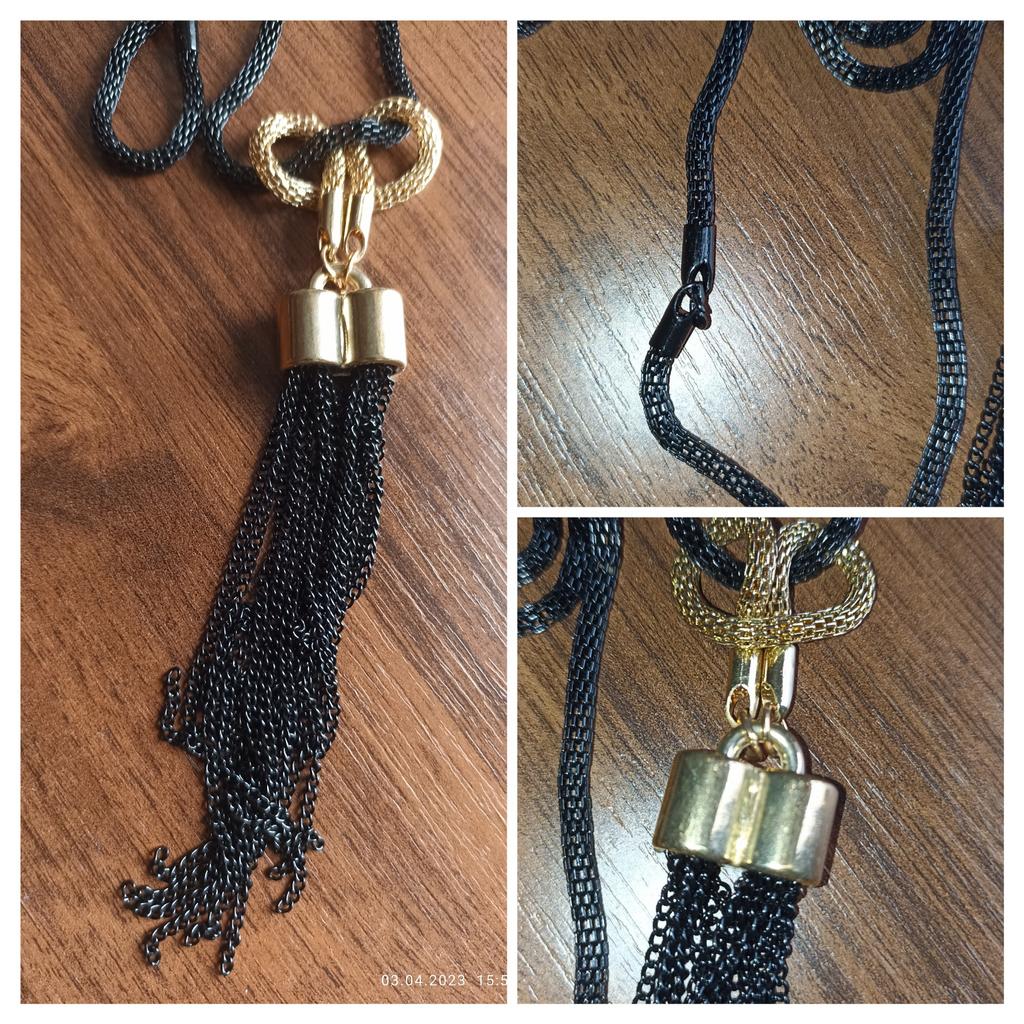 Кулончик мне понравился. Смотритмя одинаково красиво и благородно и с платьями, и с блузками. Подойдет и к юбкам, и к брюкам. Выполнен качественно, цепочка прочная, покрыта черным лаком по-моему. Нижняя часть украшения - это кисточка из нескольких таких цепочек, закрепленных колечком под золото. Украшение классное, к покупке рекомендую