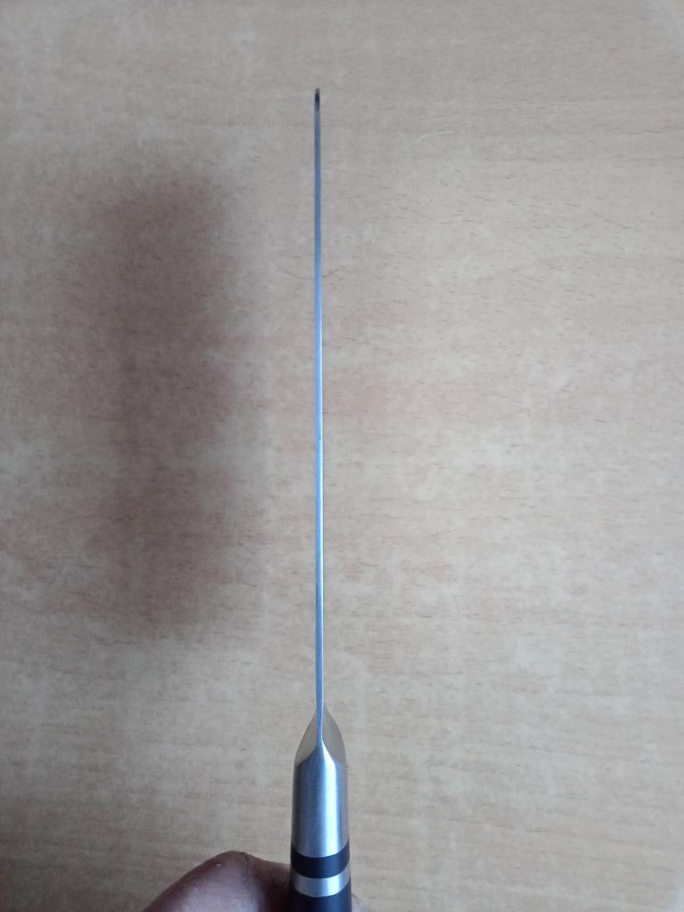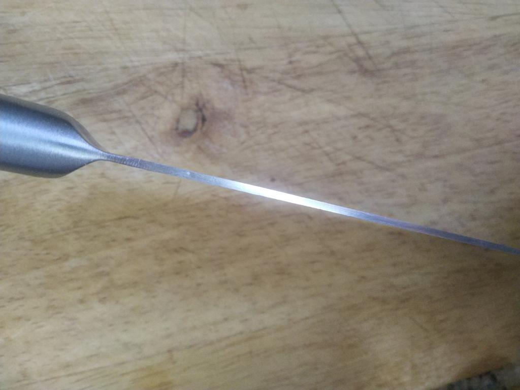 Первое впечатление очень хорошее. Нож очень лёгкий, тоненький, красивый рисунок на лезвии, пластиковые ножны, удобная рукоять, развесован точно по пальцу, металл издаёт правильный приятный звон. Даже не верится, что за такие деньги можно было купить такой нож. Из подобной стали, но от другого производителя, уже покупал шеф и овощной. Очень хорошо зарекомендовала себя. Относительно долго держит заточку, легко правится. Можно об обух другого ножа. Но, из-за короткого и узкого хвостовика, шеф сломался по обрезу ручки. С этим ножом пугает подобная перспектива. Судя по весу ручка у него пустотелая, слышно даже, как внутри болтается какой-то кусочек металла. Насколько надёжно он сделан покажет время.