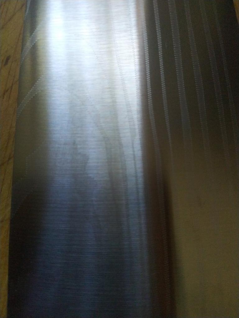 730₽, Острый изначально. Предохранительный чехол из пластика, он немного разбит (не важно: всё равно ножу в подставке быть). Непривычно, что заточено ВСЁ лезвие (внимание любителям хвататься пальцем за ближний к рукоятке край), но мне так даже больше нравится, а то обычно приходится стачивать сбег/бороду самостоятельно. По фото в карточке не видно: не думайте, что полотно - слоеная ковка. Волны и полосы представляют собой точечную гравировку-узор, а полотно цельное. Поделка НЕ совершенная, есть недочёты, дефекты (соответственно, ограничения по эксплуатации), но мне нож понравился. Посмотрим, не отвалится ли в работе полотно от рукояти (передатчик = хрупкость). Форму даже толком не обтачивали. Рукоять не скользкая. Испробован на сыре, помидорах, перце и вареном мясе - очень хорошо! По использованию. Эксплуатация ограниченная, так как до сих пор непривычно, НО обнаружен существенный минус - появились пятна ржавчины на полотне. Мы не оставляем нож мокрым после мойки (вытирается, потом в стойке хранится до применения), грязным не залеживается, фрукты им никто не резал. Смотрите фото в конце.