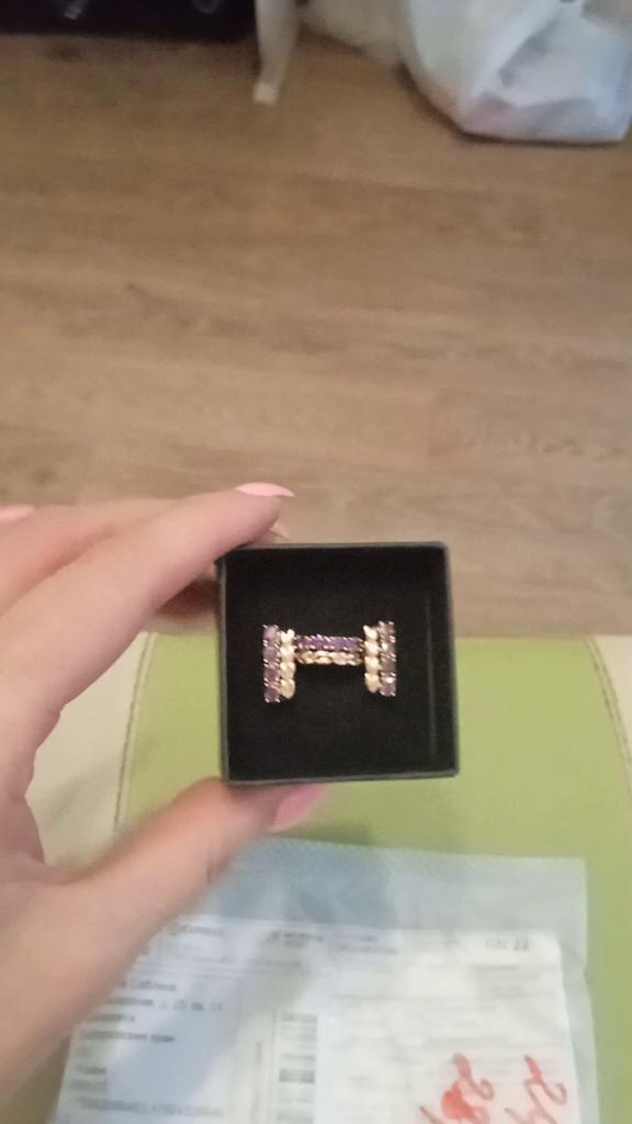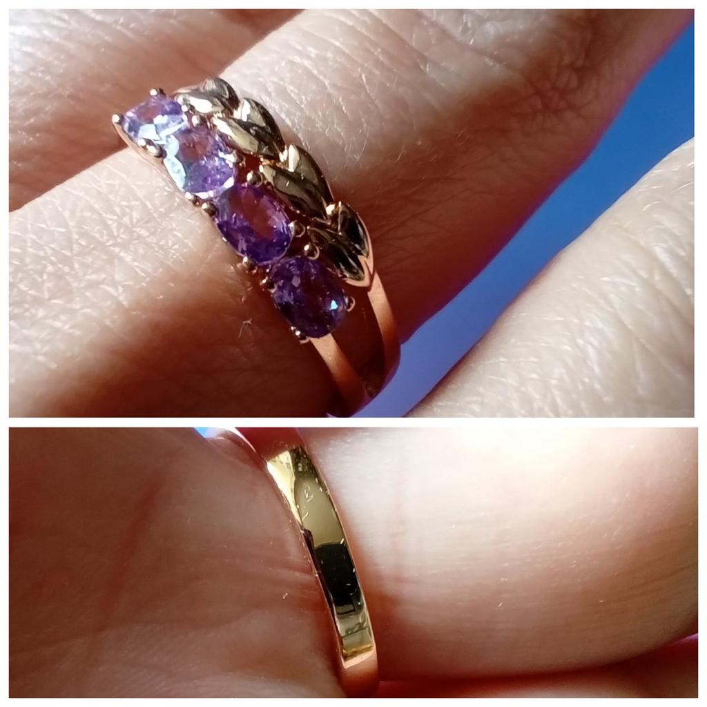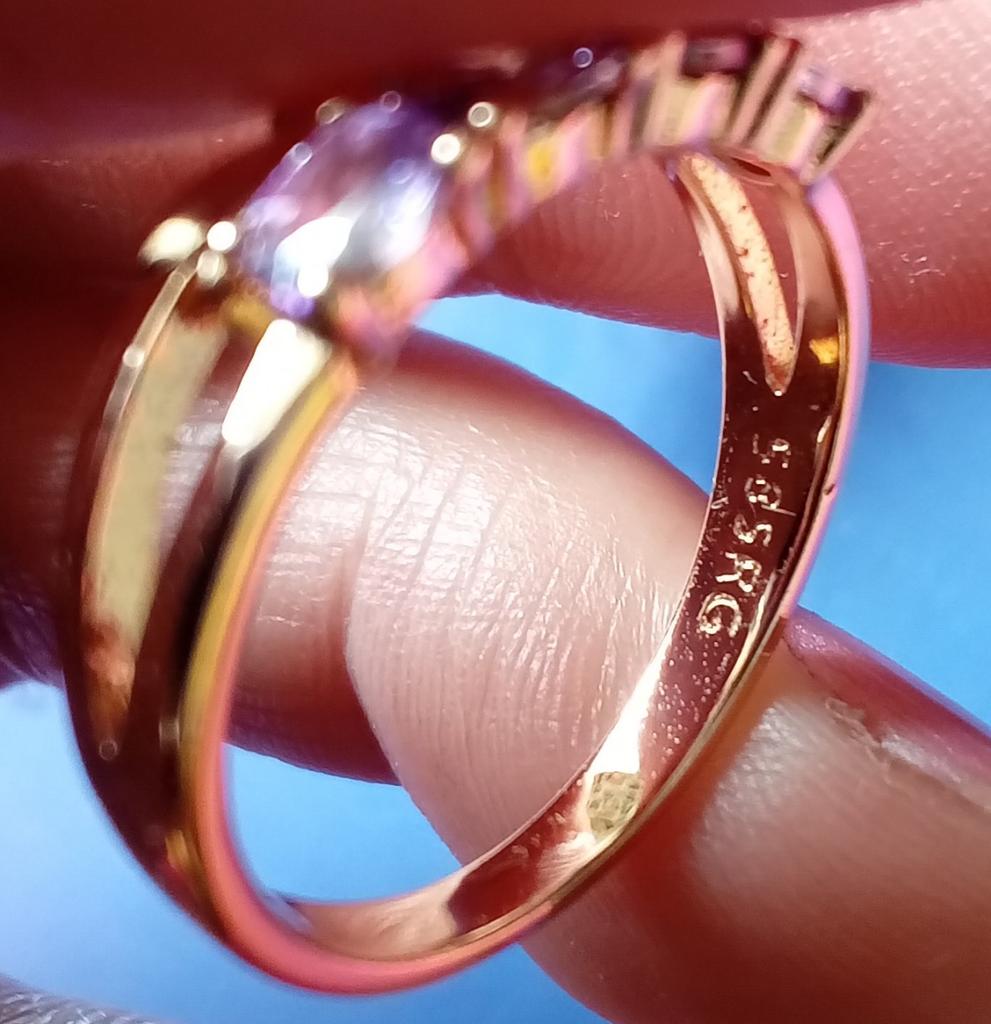 Кольцо к серьгам с фиолетовыми кристаллами, смотрится как двойное: обручальное и с украшением. Угадала с размером, заказала 8 , подошло точно по моему размеру. Кольцо очень красивое, хорошо обработано, без "заусениц", без царапин, кривизны. Сделано очень аккуратно, с пробой внутри 585RG. Заказом очень довольна!
