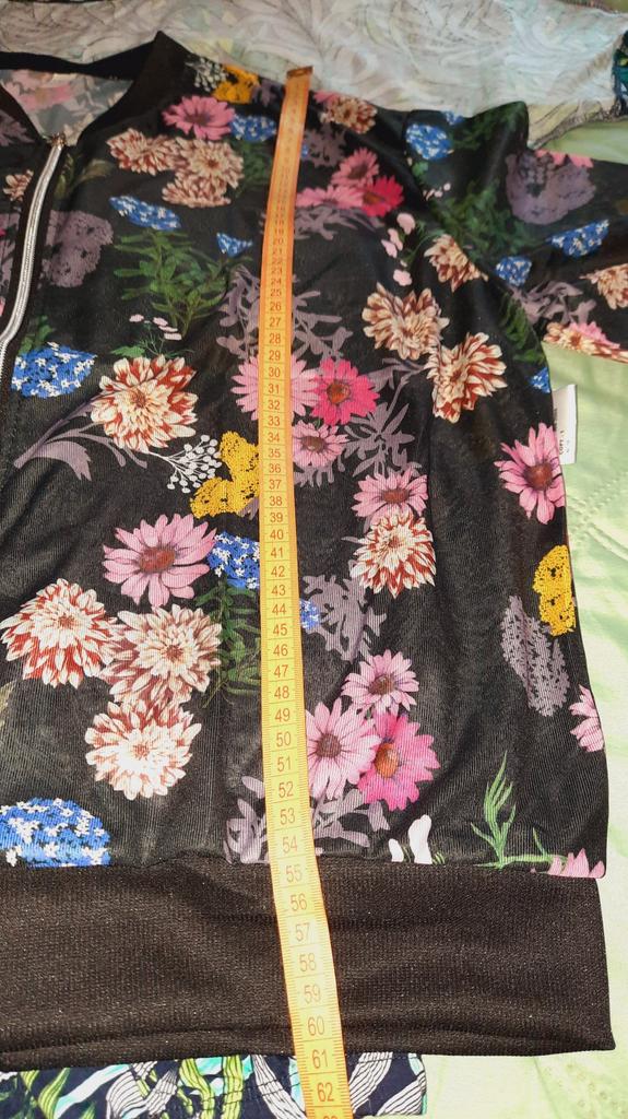 Душевный бомбер на лето. Интересный и яркий рисунок с хризантемами, тонкий, практически прозрачный трикотаж, напоминающий по толщине шифон. Взяла размер несколько больше своего, что бы бомбер действительно смотрелся бомбером. (Мои параметры Ог - 107см, От - 86 см, Об - 118 см, рост 180 см.) Фактическая ширина куртки на уровне груди 123 см, размер 5XL. Длина куртки 63 см, длина рукава 64 см. По модели длина куртки не особо большая - на мне, с моим ростом, куртка немного ниже талии, но при этом, у куртки немного спущено плечо и рукава сели на место - ни коротки, ни длинны - в самый раз, что не всегда бывает, учитывая мой рост и длинные руки. Измерения готовой куртки соответствуют размерной таблице. В целом, отшив аккуратный, особо оставленных хостов, ботвы и ниток не заметила. Единственное замечание - вверху припуски молнии стоит при настрачивании подворачивать дважды и прятать под молнию, а не оставлять свободно. Мой внутренний перфекционист по этому поводу бурчит, очевидно, что в этом месте придется слегка доработать, что бы при открывании куртки эти свободно оставленные припуски концов молнии не мозолили глаза. Молния металлическая, смотрится достаточно стильно в сочетании с рисунком и фасоном изделия. Куртка очень лёгкая, она совершенно не греет, понятно, что она не спасет в прохладную погоду, но может использоваться просто как стильная ветровка-бомбер для теплого летнего вечера. На промо-фото на странице изделия из-за фото- обработки рисунок на ткани смотрится ярче насыщенность явно прибавили. На моём фото цвет куртки точно соответствует тому, что в реальности. Заказывала за 640 рублей в момент скидок и использовала купон - просто отличная цена. Доставка за месяц. Обработка и отправка заказа оперативная. Куртка была сложена на картонной подложке и упакована в пакет. Продавцу спасибо. Джум спасибо. Курткой я вполне довольна, к покупке рекомендую.