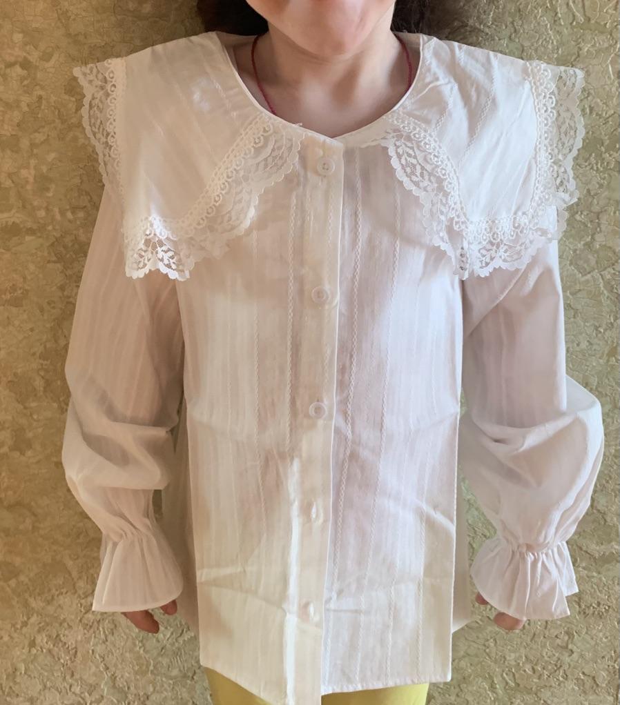 Заказывала на вырост,по размеру сказать не могу. Приятная ткань, очень красивая блузка,воротник прелесть