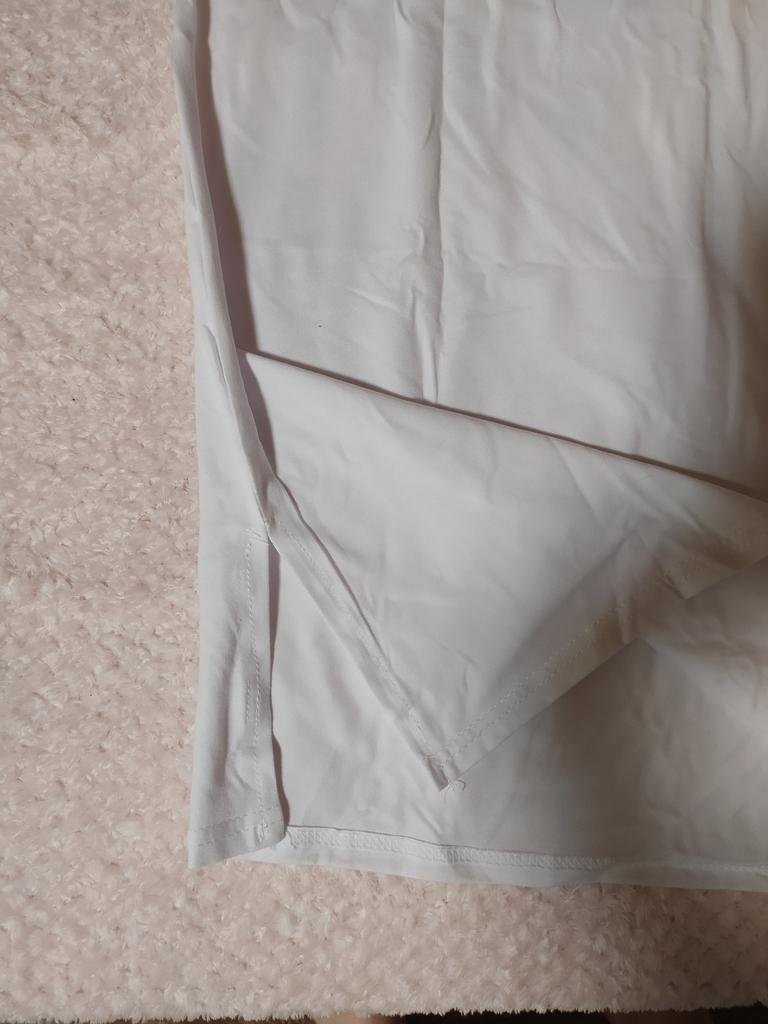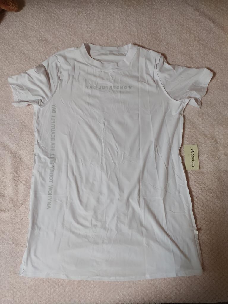Длинная белая футболка с принтом.Материал синтетический, но приятный к телу.Для лета под лосины будет замечательно.На параметры 100/92/107рост 160см заказала XXL, футболка подошла хорошо.С боку футболки небольшой разрез.Футболка подойдёт для высоких женщин,девушек,кто любит спортивный стиль.Качество футболки хорошее,будет носиться долго,но от фото продавца футболка отличается.Рекомендую к покупке.