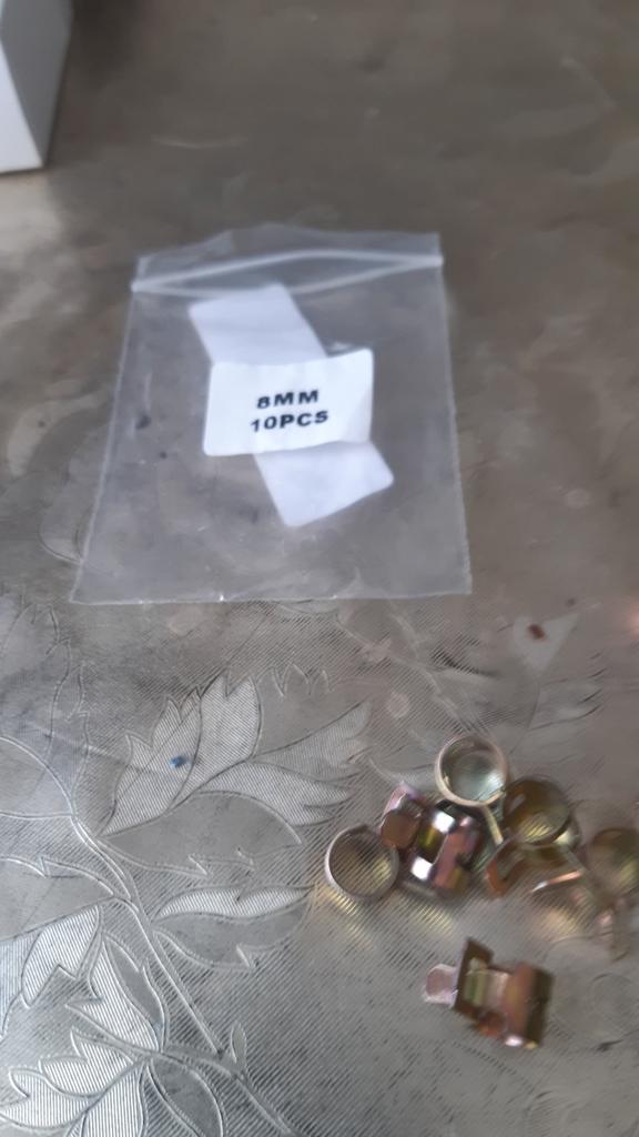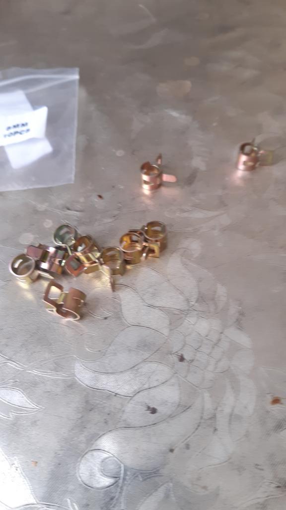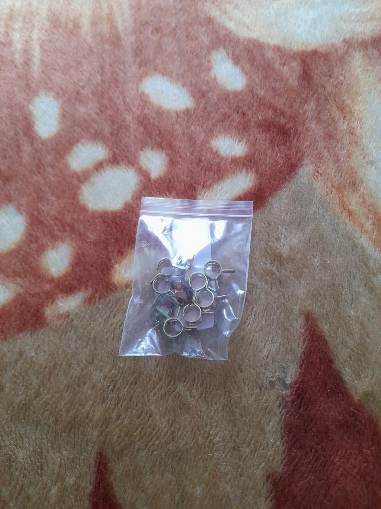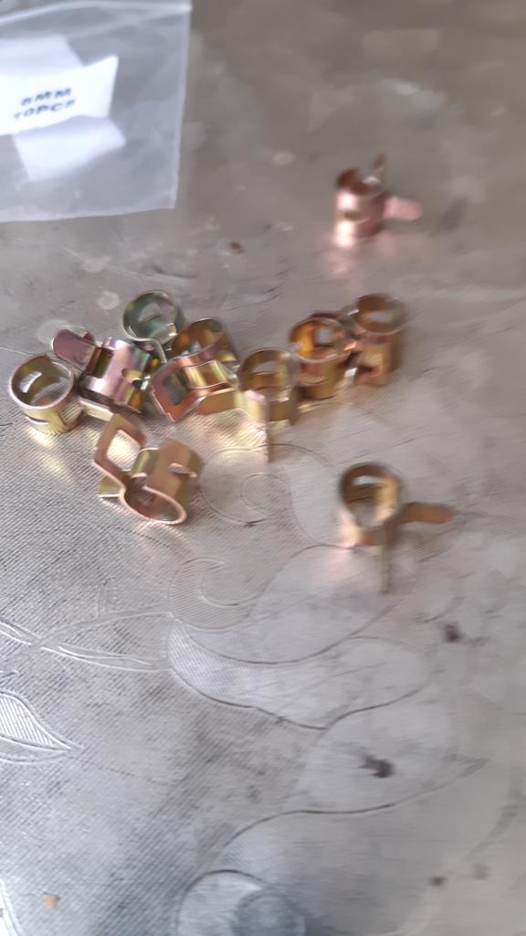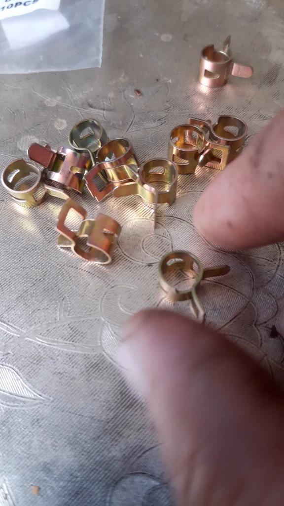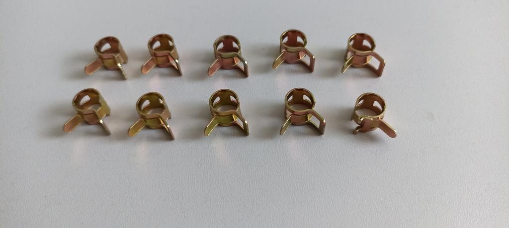 Пружинные хомутики для топливных шлангов, брал под диаметр приобретённых тут же трубок. Жёсткие, свободный ход не очень большой, но функцию свою выполняют хорошо.