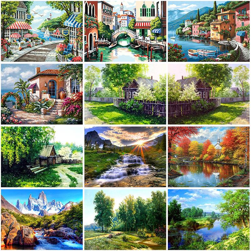 5D полная круглая дрель дерево алмазная живопись пейзаж вилла вышивка пейзаж Алмазная мозаика вышивка крестиком украшение дома