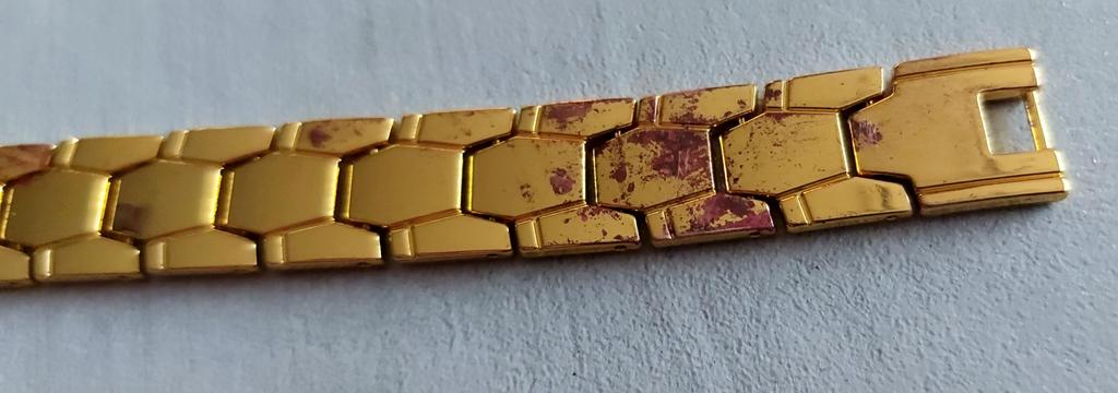 пришел совсем другой браслет - 1/на фото- ширина 18мм-пришел 15мм -2/ромбы сильно вытянуты-не как на фото -3/на фото -поверхность матовая- пришел дешевый глянец -4/на фото -позолота- пришло- дешевое покрытие/которое СРАЗУ слетело