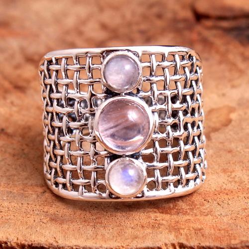 Кольцо с тремя камнями, ювелирные изделия из розового кварца и лунного камня, ювелирные изделия из стерлингового серебра 925 пробы, кольцо с натуральным драгоценным камнем
