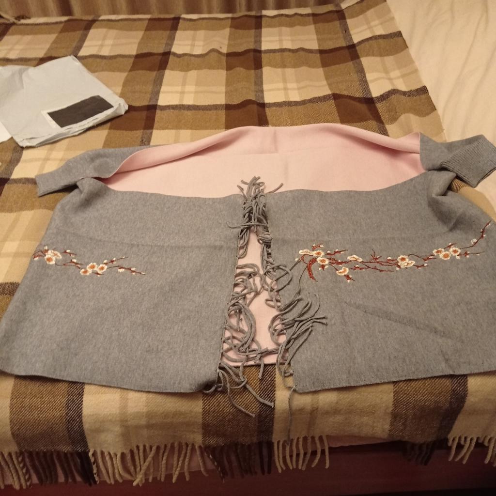 Очень понравился мне этот широкий шарф. Обалденный. Двухсторонний, цвета приятные, вышивка с обеих сторон, ткань мягкая. А вот дальше НО... Шарф малюсенький. Я никак не могла понять, как же его надеть. Решила всё измерить. Вытянула руки в стороны, муж померял от запястья до запястья через плечи. Получилось 136 см. Померяла на шарфе от манжета жо манжета. Получилось 115. Все-таки натянула на себя и манжеты уползли вверх выше локтей. Спинка даже до лопаток не доходит. Шарф на девочку лет 11-12. Теперь голову ломаю, что с ним делать. Попробую отпороть манжеты, из спинки сделать воротник-шальку. Читала отзывы, все восторженные. Но никто не написал, что размер детский. Ни одна взрослая женщина, даже тонюсенькая, не может это надеть, потому что надо иметь узкие плечики и руки покороче. Очень обидно.