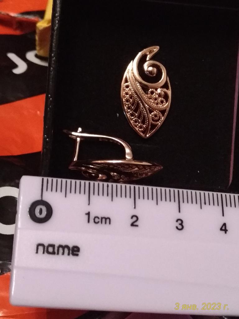 Серьги под золото Качественно выполнены, замок - английский. Верх 9 мм, до замка 6мм Длина 2,5 см, ширина в самом широком месте 1,8 см.