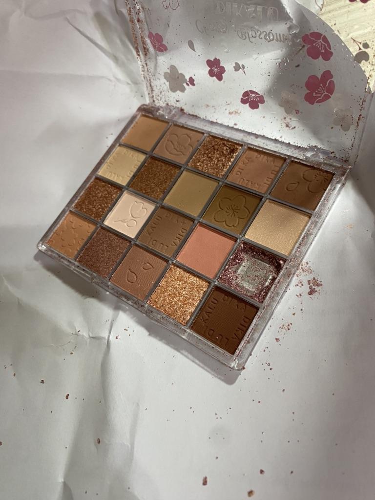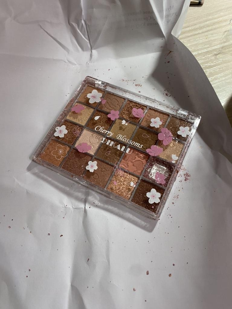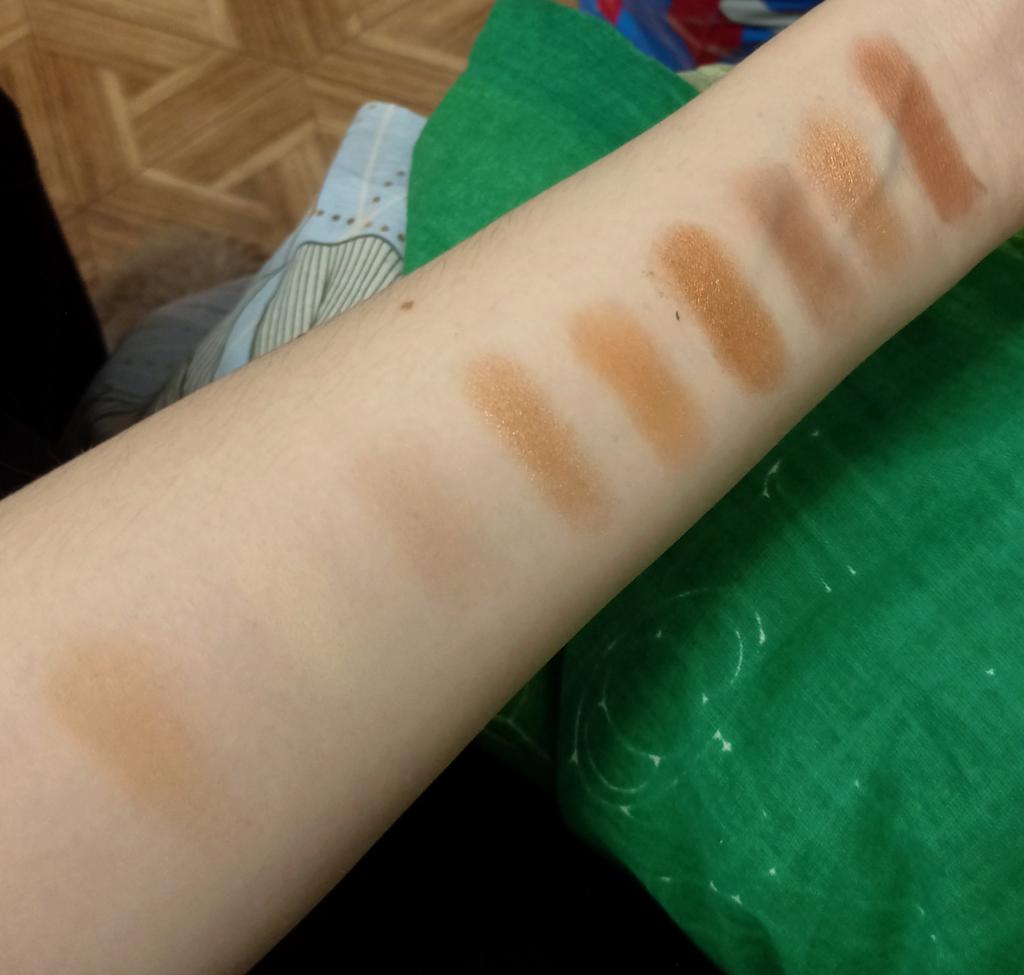 Тени хорошие, пахнут приятно. Пришли в кортонной коробке и пакете без какой либо пупырки. Один цвет рассыпался вовсе. Шимерные цвета переливаются, блестят и легко наносятся. Светлые почти не заметны. Остальные цвета лёгкие. Смывается легко на не подготовлено коже. Срок годности в порядке. В целом покупкой довольна, обидно за разбитые тени.