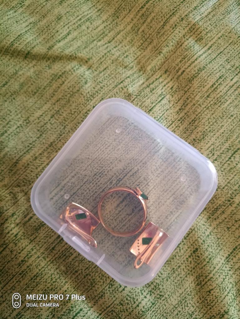 Заказала колечко и сережки, чтобы получился комплект. Прибыли вместе в пластиковой коробочке, хорошо упакованные. Кольцо подошло по размеру. Блестит, прелесть! Не отличить от розового золота. Сережки маленькие, красивые, замочки работают. Я довольна заказом!