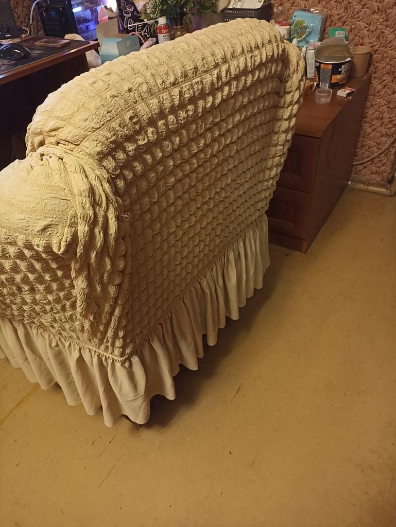 Чехол хороший, но на моё кресло немного не подошёл. Пристроила, но как то не совсем так. Сзади задирается. Возможно попробую подшить "уши". Дело в том что по бокам там углы как под подлокотники, а у меня боковушки плавно в спинку кверху идут. Пришлось прятать эти углы в складках на верху. Если спустить их ниже, то ткань торчит в растопырку. Фото попозже постараюсь сделать.