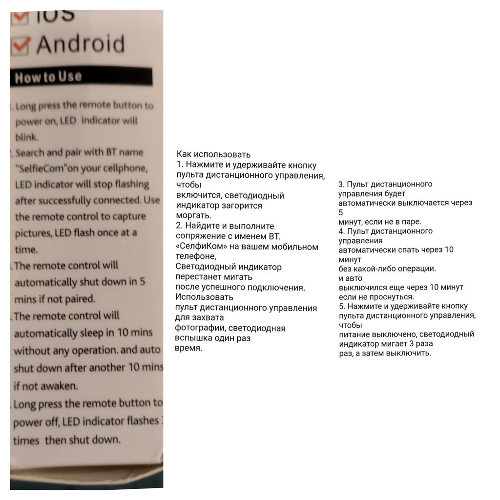 ♦️Монопод или селфи палка♦️ Можно использовать как штатив для съёмки или как селфи палку. ✅Ножки и держатель телефона выполнены из пластика, я б не сказала что он хлипкий, плотность достаточная. ✅Держатель телефона вращается на 360 градусов, телефон можно закрепить как вертикально, так и горизонтально. ☑️Выдвижная пружина для крепления телефона очень тугая. ✅В сложенном виде длина всего 22 см, очень удобно брать с собой, места много не займёт. ✅При выдвинутой штанге длина 59 см без учета крепления для телефона. ✅Длина самой штанги 41 см. ✅Блютуз кнопка закреплена на корпусе, не будет валяться отдельно и не потеряется. ✅С телефоном кнопка коннектится моментально и без проблем, просто нажимаем секунд 5 на кнопку до загорания рядом с ней синего индикатора, предварительно включив блютуз на телефоне. ✅Поиходит с уже установленной батарейкой в кнопке. ✅Инструкция на коробке на английском языке... Веб перевод поместила в карусель. 💖За такую цену отличный монопод😍 Покупкой я конечно же довольна. ❤Всем счастья и здоровья и конечно же удачных покупок и скорейшей доставки☺️