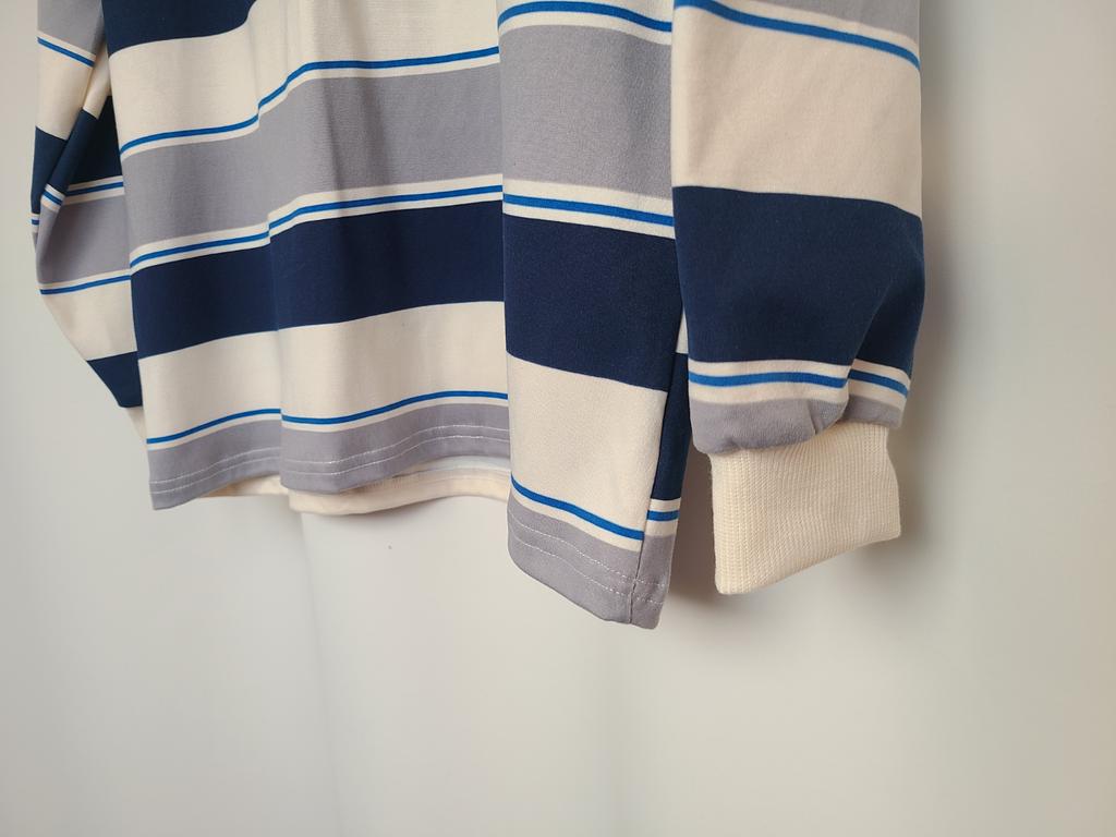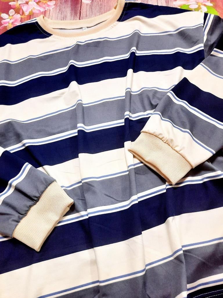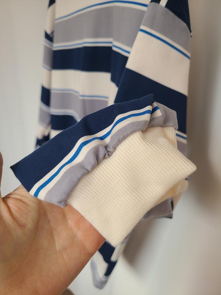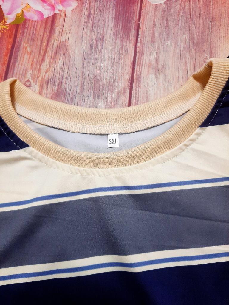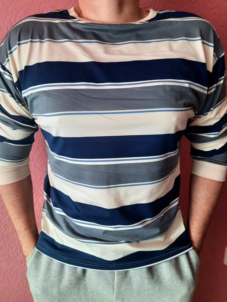 Меня редко устраивает качество заказанного товара, я с этим свыклась и стараюсь не строить иллюзий, делю то, что вижу на фото, на 3! В этот раз я ооочень довольна, думала, что будет фактура тонкой майки... Но качество этой вещи на высоте! Футболка плотная, есть даже подозрение, что процентов 50 коттона! Но... Как же без ложки дёгтя в этой бочке мёда? Дело в том, что я, открыв посылку, ещё не вынимая вещь, была очень удивлена цветом!!! Я не страдаю дальтонизмом, как все женщины, но почему цвет совершенно не тот?!! На фото это бежево-черно-серые полосы, резинка по ворот и на рукава - бежевая. А я получила цвет бело-сине-серый, оторочка белая😟🤔🤨... Как-то совсем не то, что я ожидала! Конечно, оставлю, но неприятный осадок остался! Но я все равно поставила 5 звёзд за очень хорошее качество, спасибо! Дополняю свой отзыв: явно поторопилась с похвалами! К качеству трикотажа по-прежнему нет претензий, но к пошиву много. Я сделала фото левого бока, левой стороны. Думаю, хорошо видны косяки, то есть сам шов и полоски на рисунке, которые никто не по трудился совместить!!! С правой стороны есть небольшая несостыковка, но слева - это нечто совсем несуразное! Я расстроена очень... Теперь решила внести дополнения. Редко меня настолько устраивает качество материала! Плотный, немного, на мой взгляд, даже бархатистый... Конечно, синтетика, но чудо как приятна в носке! Стирается легко. Есть в крое доя меня существенный недостаток - впереди ворот лезет наверх, постоянно образуется некрасивая складка, просится более глубокий вырез!