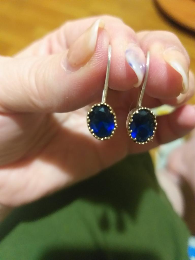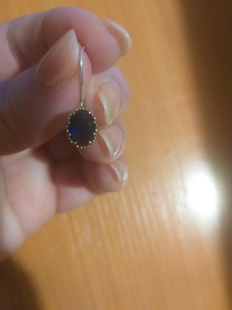 Одна серёжка криво прикреплена к душке. Видно на фото. Прошу вернуть деньги 1849руб или прислать качественное изделие. Производителю 0 баллов. За это сняла баллы. Джуму спасибо. Цвет стекла или камня синий, пишут, что сапфир, не знаю, не проверяла. На металле стоит цифра 925, тоже не проверяла. Добавляю фото обеих серег сразу. Сразу видно брак!
