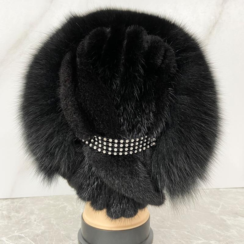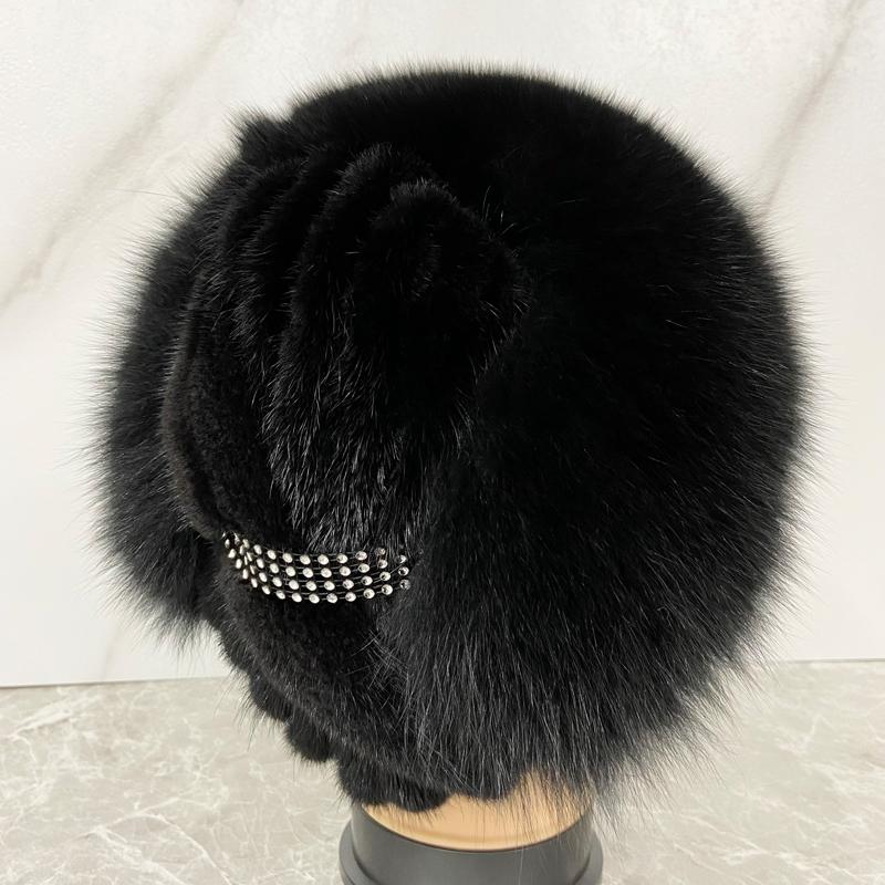 Стильная женская зимняя шапка с бриллиантами из натурального меха норки и лисы вязаные шапочки уличная теплая женская зимняя вязаная шапка