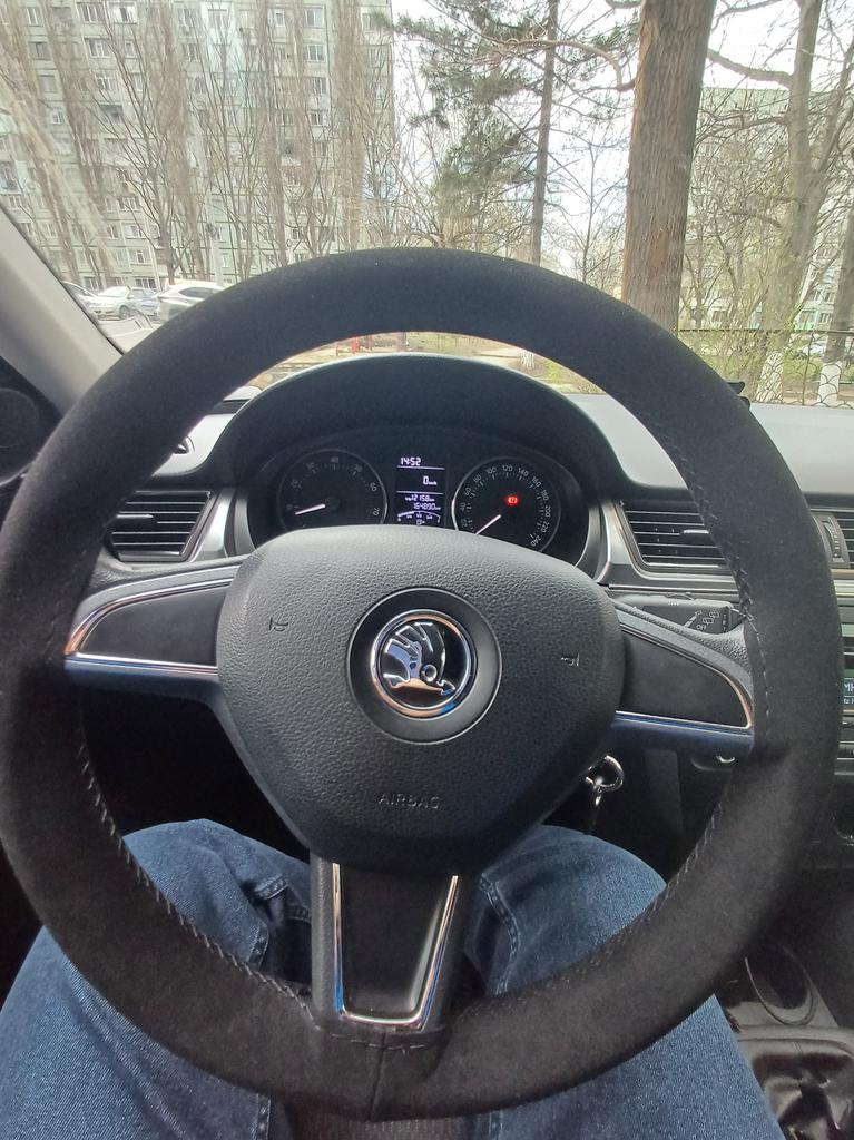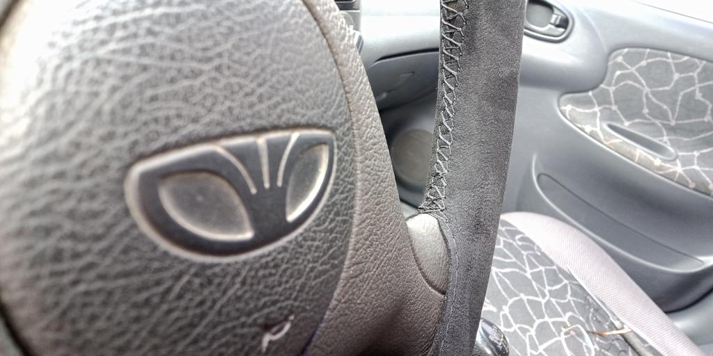 На Skoda Rapid руль 38, перед надеванием намочил чехол в воде, налез на руль но с усилием, прошивать шов нужно пока кожа мокрая тогда лучше облегает и растягивается на весь обхват руля