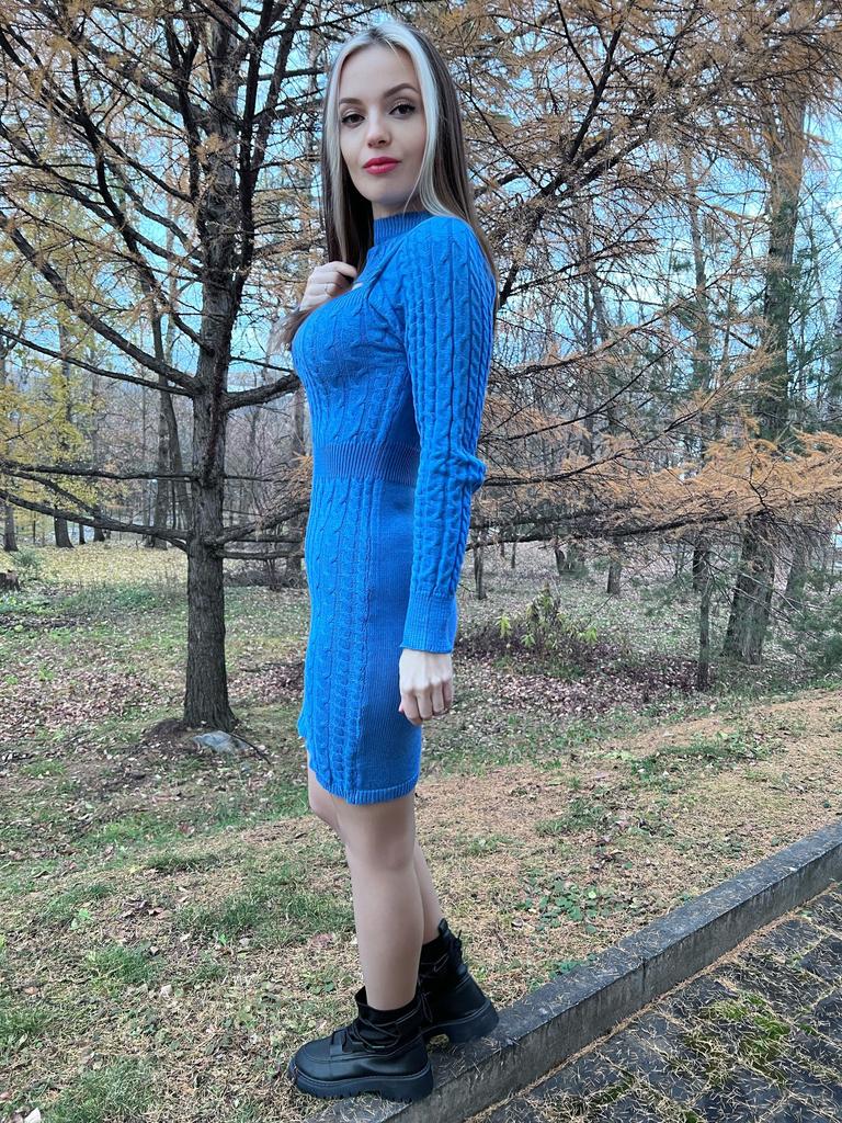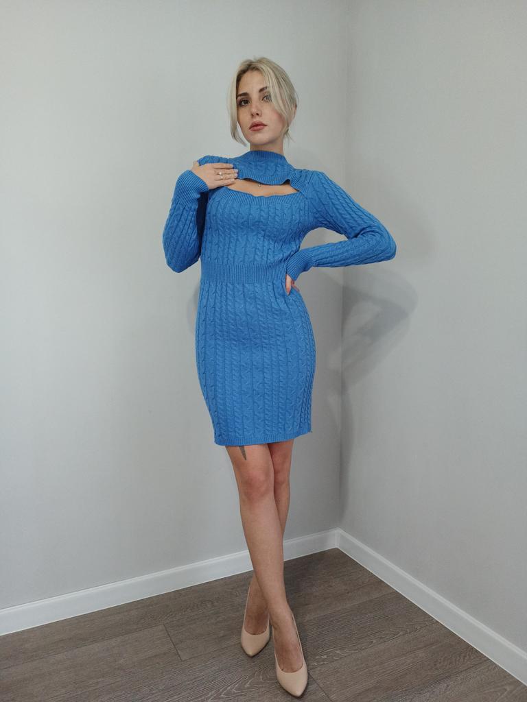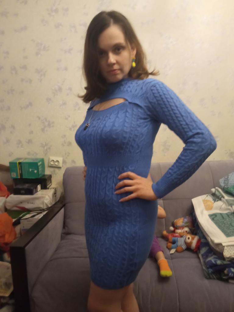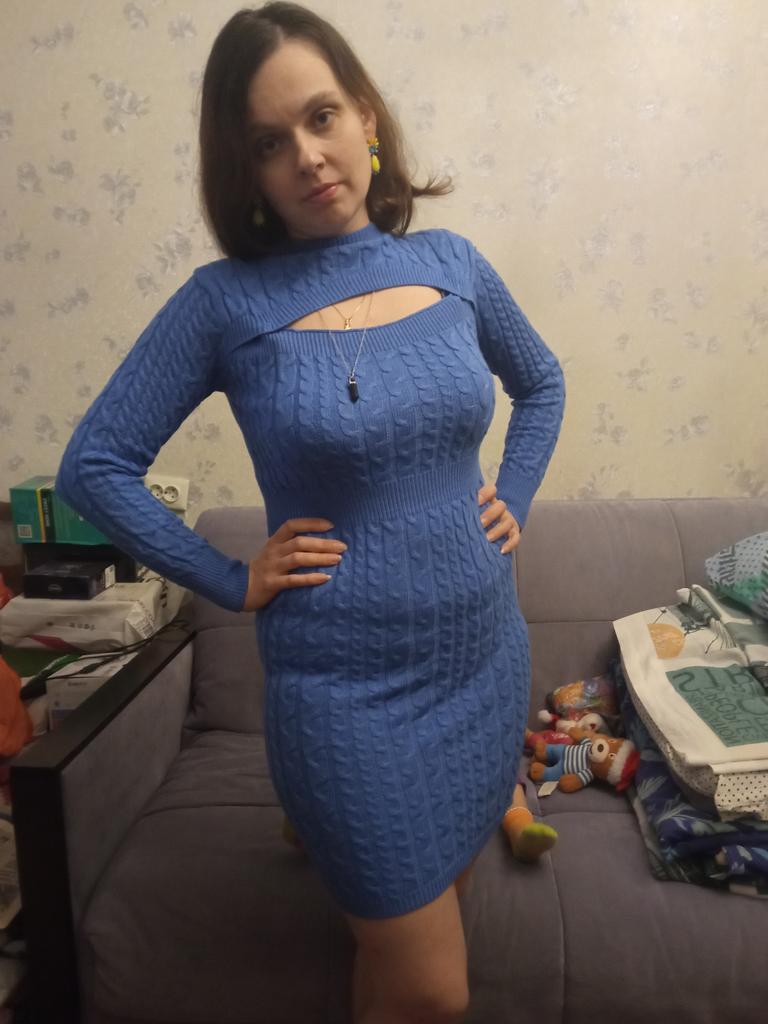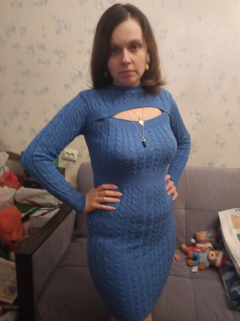 Красивое платье, цвет спокойный синий, на 46 размер заказала L, село в обтяжку, материал очень мягкий, приятный к телу, тянется хорошо, подойдёт и на больший размер, изюминка этого платья - красивый вырез, пришлось его чуть ушить по краям, теперь лямок от белья не видно, связано хорошо, без брака, продавцу спасибо🤗, к покупке рекомендую🥰 В данном магазине заказала три разных платья в голубом цвете, все оттенки в разных моделях разные, от бледно-голубого до синего, я всеми довольна