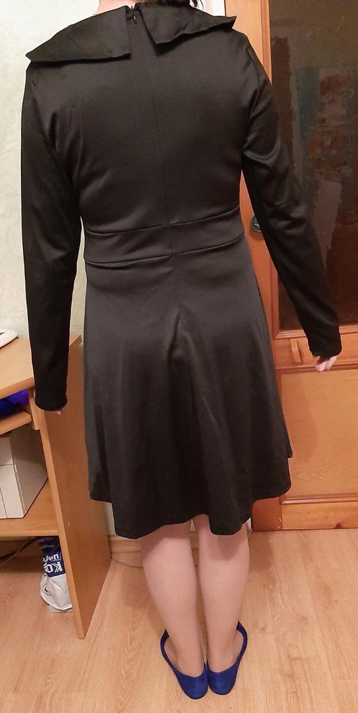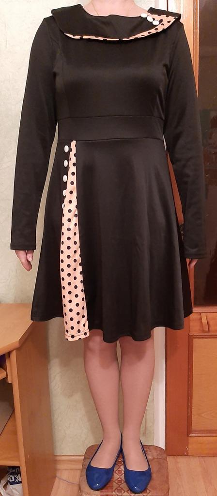 Платье неудачное, брала 52 размер, оказалось, что куцее платье, прикрывает коленки, спереди вроде, ничего, а вот сзади-ужасно. Ткань-голимая синтетика, недышащая, да и горошек не очень четкий. Одним словом-разочарована, хотя очень надеялась, что приобрету классное платье. Размер если брать больше, то может будет длиннее платье, тогда переделка будет необходима. Буду сдавать
