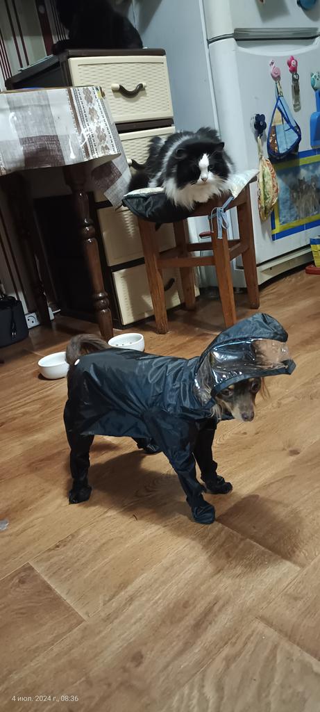 Собака на меня надулась! 🤪😊 Но на улице в дождь ещё не гуляли, поэтому отзыв будет только о первом впечатлении. У меня крупный ши-тцу с мохнатой шерстью. Брала самый большой размер, который был в наличии. Влез на только-только в груди. Но ноги немного длинны. При ходьбе шуршит. Лапы на полу разъезжаются. Отросточек на хвост лишний (хвост очень мохнатый и длинный), здесь он скорее на что-то гладкошерстное и укороченное. Попробую из него сделать ушки и пришью к голове. Ткань показалась с пропиткой, но пропускает или нет воду пока сказать не могу. Радует, что все лапы полностью закрыты! А то у всех прежних комбезов лапы были всегда очень грязные, а тяпти найти подходящие не смогла
