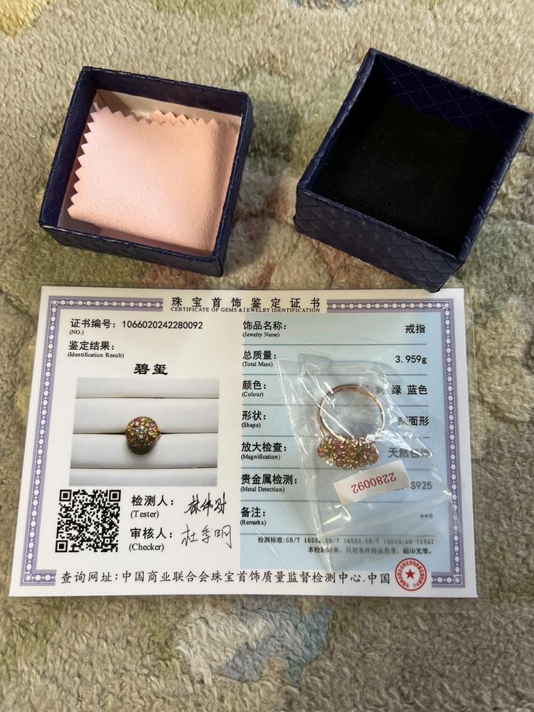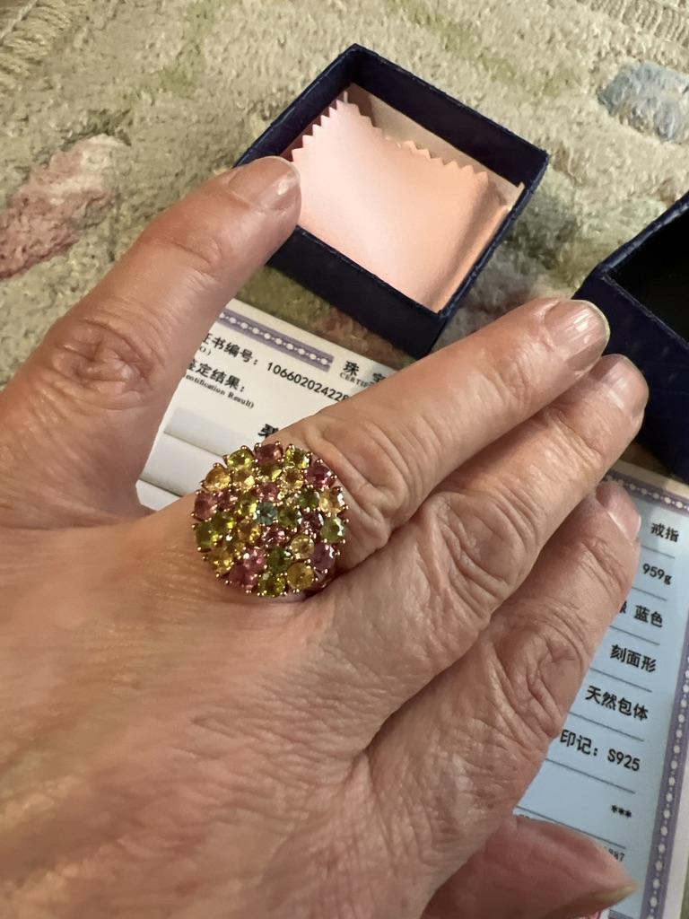 Прекрасное кольцо, просто прелесть.Очень давно хотела и вот оно у меня сверкает на пальце в дополнение к серьгам и бусам с турмалинами.Размер регулируется, все камни в крапанах. Словом, красота! Сертификат прилагается.