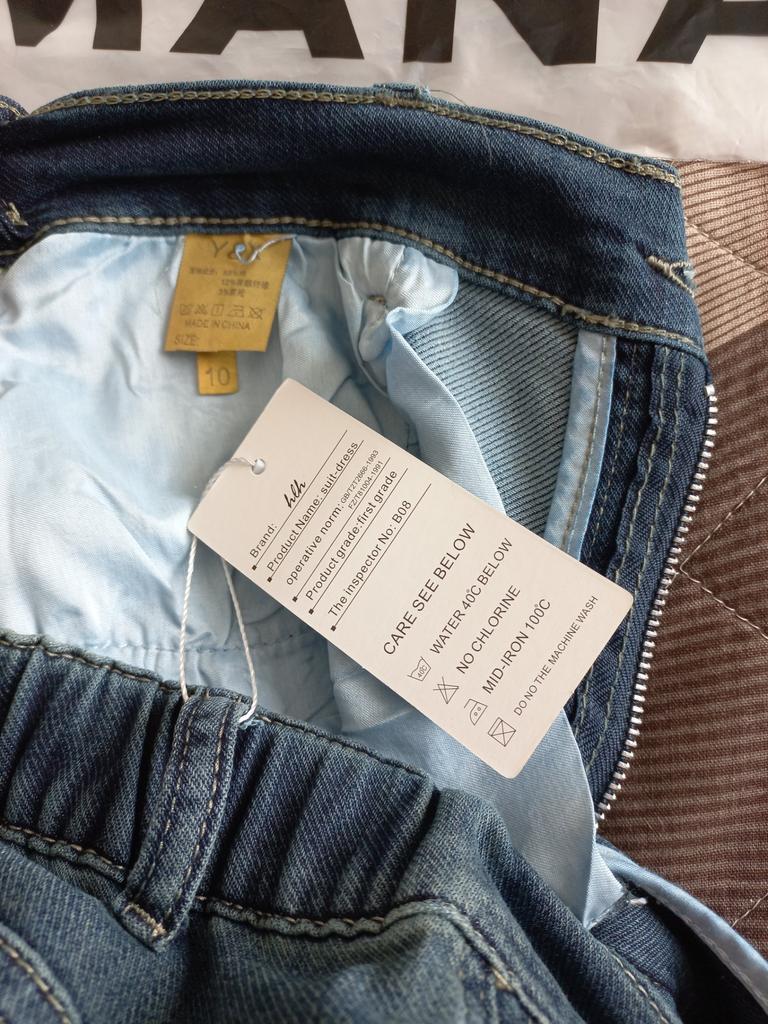Получила джинсы. При заказе ориентировалась на отзывы. И все-таки надо было брать на размер поменьше. Может быть на худеньких и на два размера больше штанишки смотрятся хорошо. А у меня при моих бёдрах в 115 см лишняя свобода смотрится пузырем. Хотя я не знаю, какой размер мне пришел. Посмотрела на другие отзывы. У всех на фото есть размер. У меня же часть бирки, где должен быть указан размер, отрезана. Под этой бирочкой есть другая тоненькая полосочка, на которой проставлена цифра 10. Что она означает, не знаю. И бумажная бирка опять же одна, а второй, на которой проставлены размер, нет. Очень некрасиво. Да и джинсы так себе. На талии со спины имеется резинка. Материал вроде бы и не совсем тонкий, но джинсы лёгкие, только на лето. А если честно, материал дешевенький. Больше похоже на спецодежду. Но опять же повторюсь, может это только с моим заказом. Ладно, доживём до лета а там посмотрим.