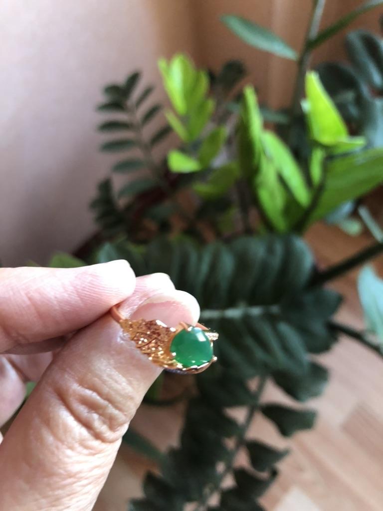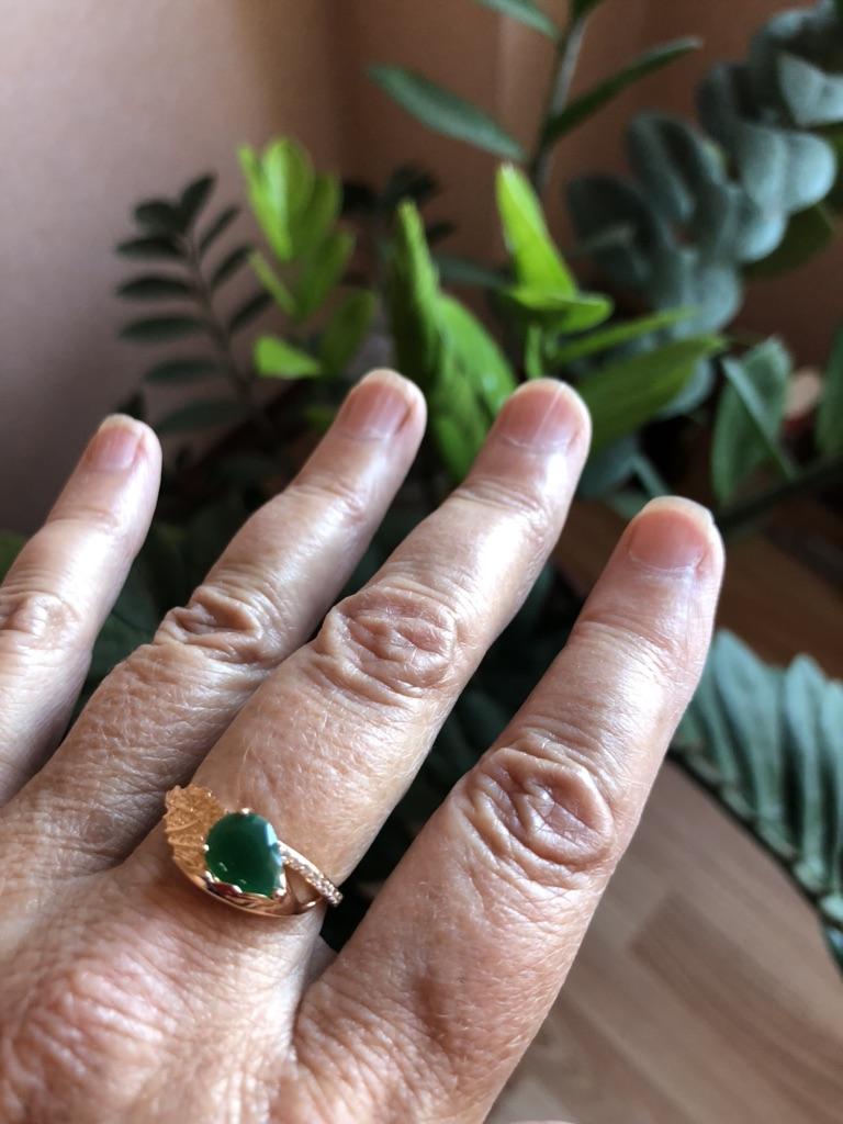 Красивое оригинальное колечко, купила в комплекте с серьгами. Мне нравится! Камешек зелёный непрозрачный, дизайн оригинальный. Всё супер! Спасибо!