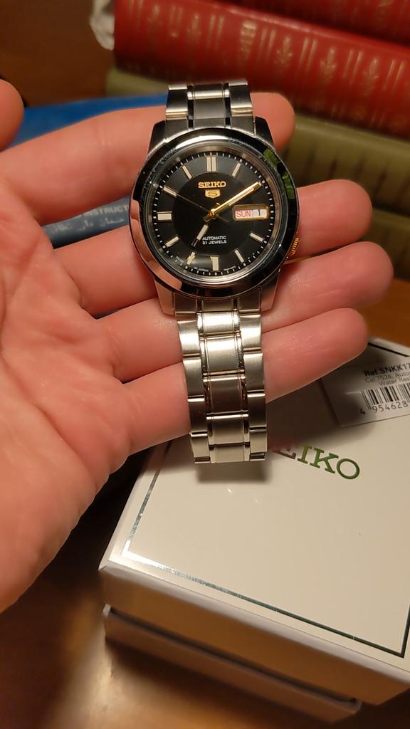 Давно, очень давно желал приобрести эти часики, ещё будучи пацаном с завистью смотрел на парней и мужиков у которых на запястье поблёскивали Orient три звезды или эти Seiko 5, надо сказать что Seiko встречались реже. Есть у меня и другие часы в коллекции, но эти, - дань мечте! Даже при такой невысокой цене, часы выполнены очень добротно и качественно, порадовал цвет циферблата, даже не цвет а глубина, насыщенность чёрного и на фоне этой бездонной черной пустоты сверкают позолотой элементы циферблата, - часовые индексы, стрелки, название бренда и логотип "5". Да, браслет штампованный, но он и был таким. Корпус полностью полированный понравилась небольшая высота корпуса под рубашку самый раз. Калибр 7S26 поначалу отставали на 20 сек. в сутки. Отрегулировал самостоятельно сейчас -7-5 сек. Часы были надёжно упакованы, доставка DHL 10 дней за что продавцу уважение и благодарность.