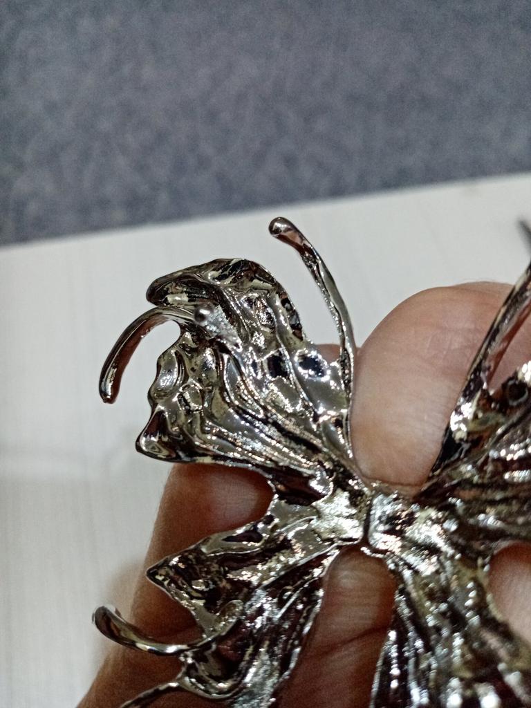 Так себе исполнение. На фото смотрится интереснее. Где тельце бабочки, думала должна была быть стразинка. Т.к. там некрасивое место, как-будто что-то отломлено. Сделано очень грубо. Кольцо само безразмерное, но металл самого колечка очень мягкий, думаю, быстро развалится. Задумка хорошая, кольцо "так себе". Крупное. Есть элементы, торчащие с от плоскости бабочки градусов на 90. Однозначно будут цепляться.