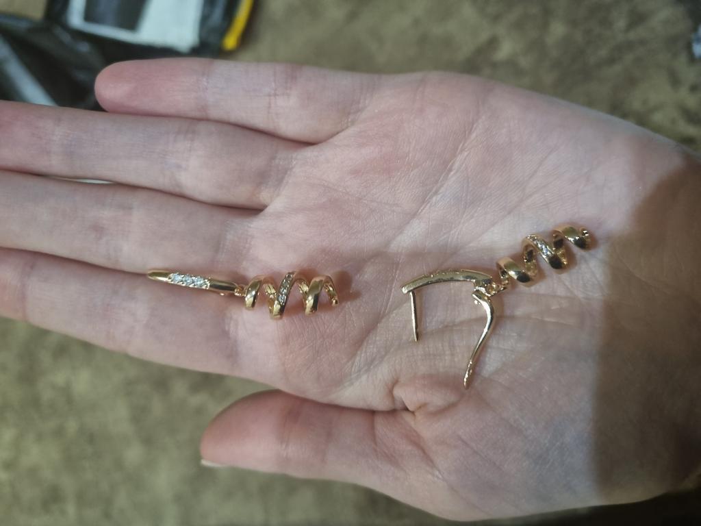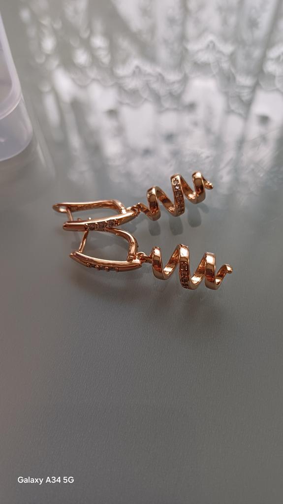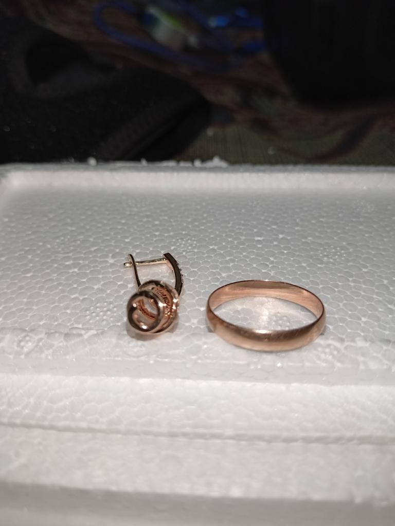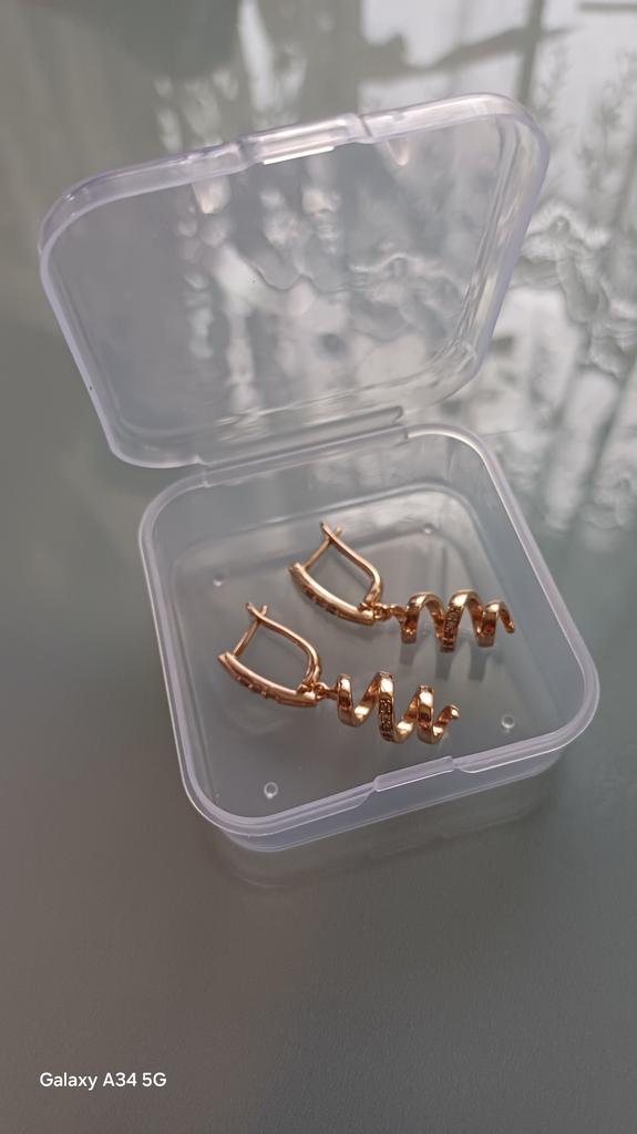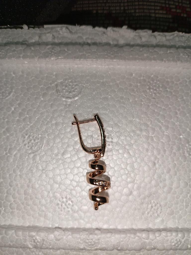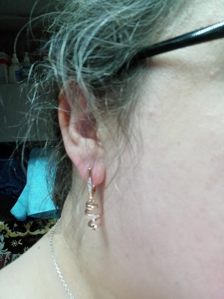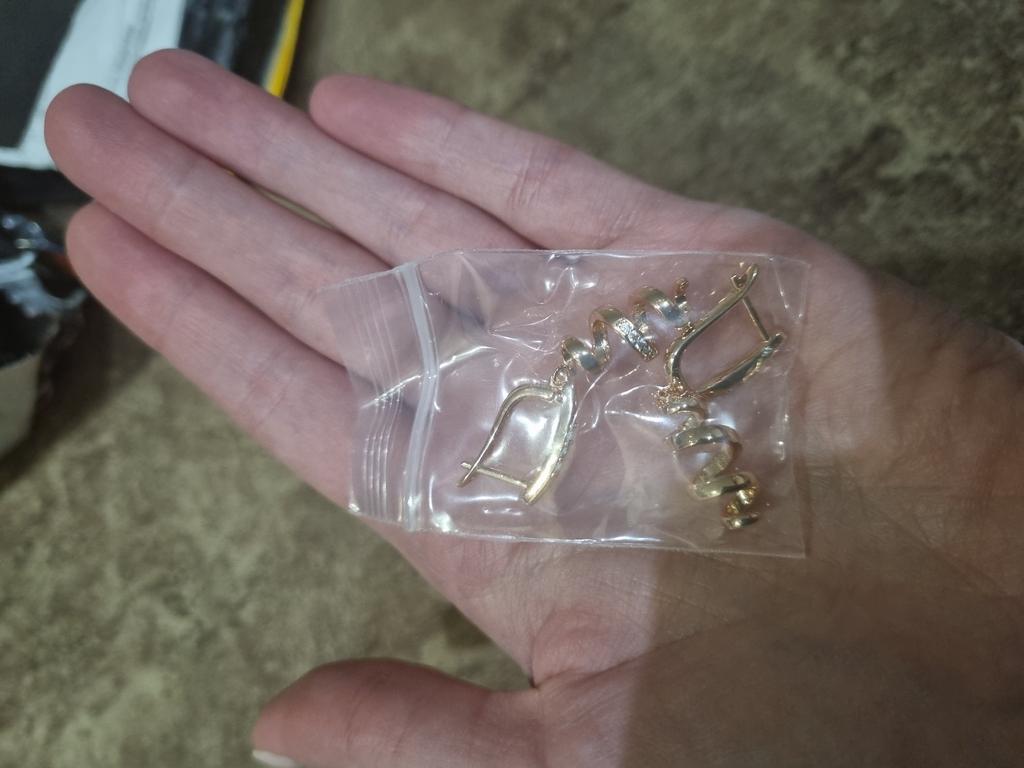 Пришли в сборной посылке с другими серьгами за два месяца.К сожалению не могу себя получше сфоткать.На мне сидят не очень из-за полной шеи и маленьких ушей,зато интересные,на фото кольцо 585 пробы для цветовосприятия.Носить буду,мыться нет.Пусть подольше цвет остаётся Спасибо,товаром довольна