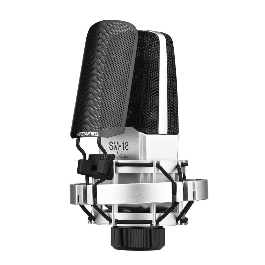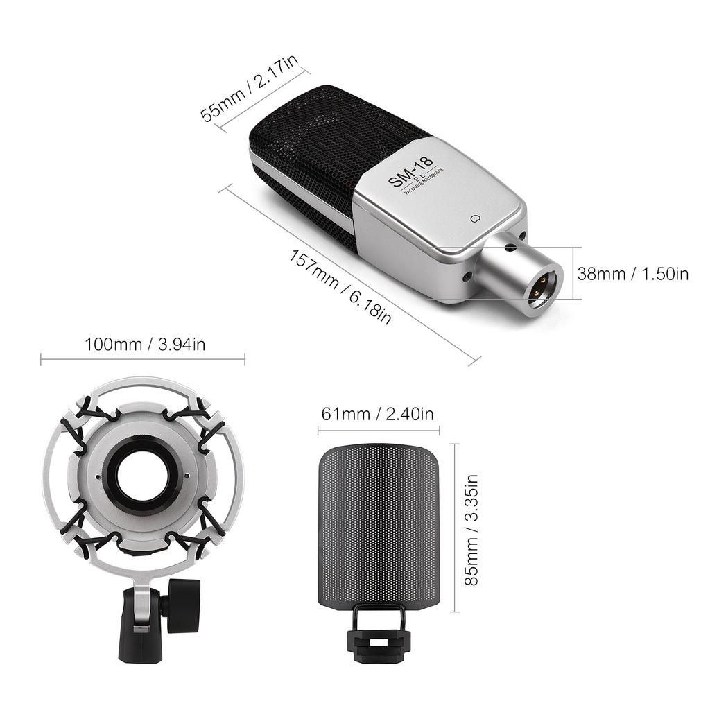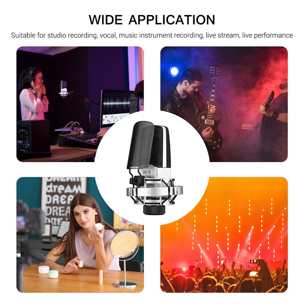 Этот профессиональный конденсаторный микрофон принимает кардиоидный рисунок звукоснимателя для уменьшения шумовых помех и точного захвата деталей человеческого голоса. Он имеет оптимизированный уровень остаточного шума, который подходит для различных сред записи / прямой трансляции. С регулируемым амортизатором и металлическим поп-экраном он «очень гибкий в использовании и подходит для студийной / вокальной / музыкальной записи инструментов, прямой трансляции и других случаев.