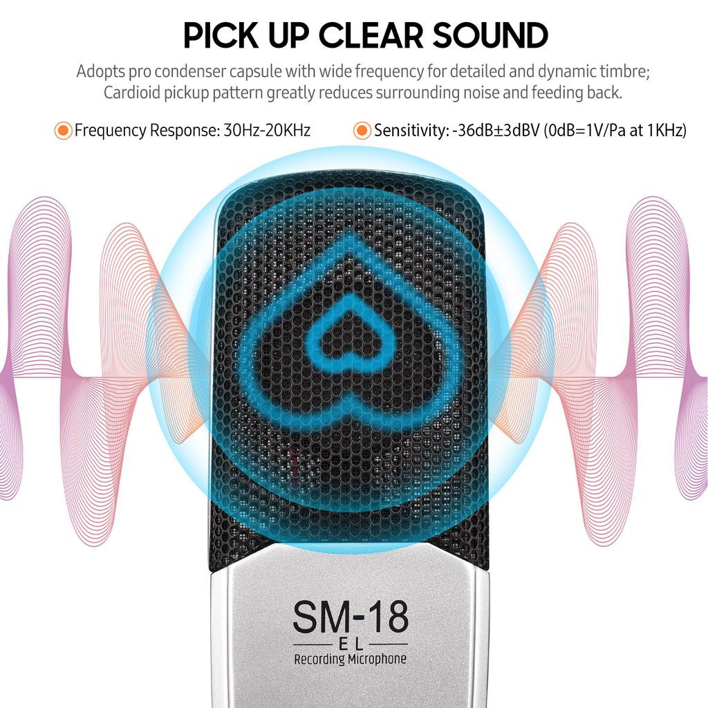 Улавливайте чистый звук: Принимает конденсаторную капсулу с широкой частотой для детального и динамического тембра; Кардиоидный рисунок звукоснимателя значительно уменьшает окружающий шум и обратную подачу, что позволяет ему правильно и четко улавливать ваш голос.