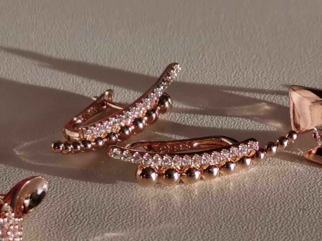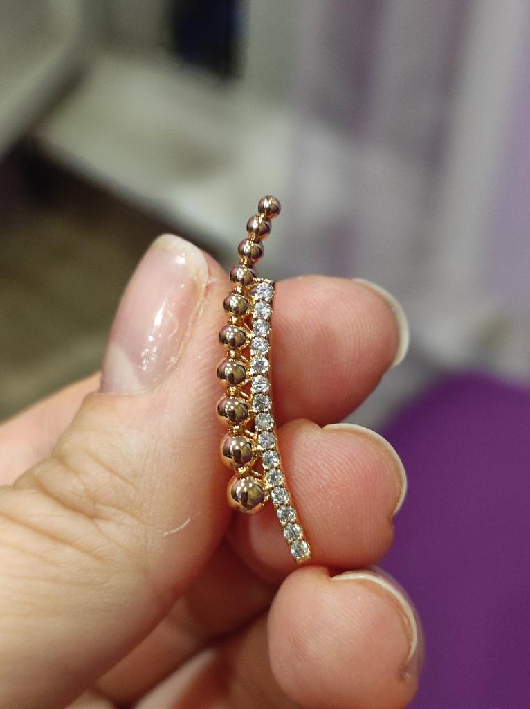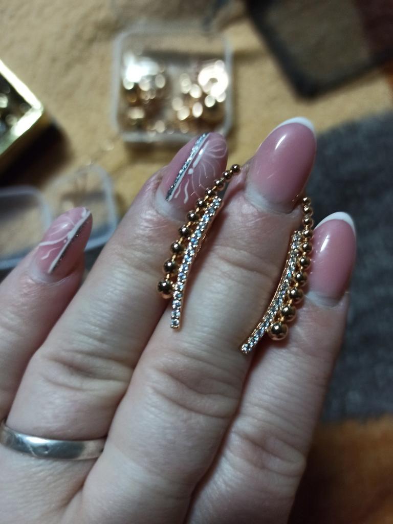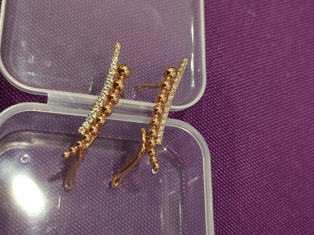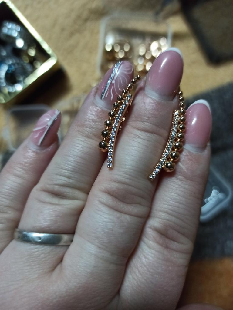 Серьги😍❤️👍 Очень красивые, с крепким, английским замком, под розовое золото, с прозрачными стеклянными камушками. Есть фото рядом с золотой цепочкой с крестиком и золотым кольцом, для сравнения цвета и фактуры. Качество на высоте. 👍 Пришли быстро. Приходят в пластмасовой прозрачной коробочке, повреждения в такой упаковке маловероятно. Дополнительно серьги ещё в маленьком пакетике с зип застёжкой. Упаковано на совесть. Потом в этой коробочке очень удобно хранить украшения, коробочка плотно закрывается, защелкивается.🎁👍 Серьги понравились❤️❤️❤️ красота, лепота😊 Алиса перед съёмкой успела потискать и пообнимать кота, все на джемпере😃 заметила поздно, прошу прощения🙆♀️😂 Рекомендуем к покупке👍