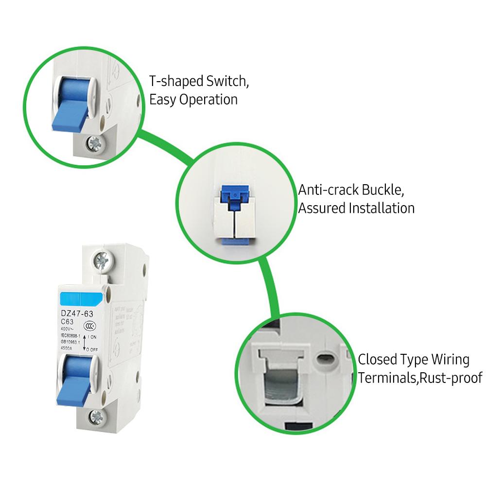 4500A разрывная способность, надежная и стабильная производительность. Многоцелевой, подходит для электрических цепей переменного тока частотой 50 Гц и номинальным напряжением ниже 400 В.