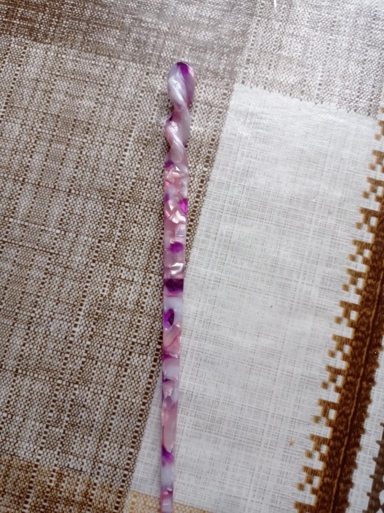 Прикольная палочка для волос, правда она фиолетовая/белая, а не розовая/белая, но это не страшно. Очень мило и красиво, только приехала вся в пыли... Изменено: материал очень мягкий, неудобно собирать волосы, плюс к этому она останется потом погнутая.