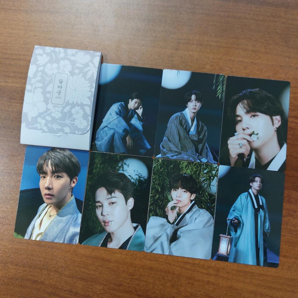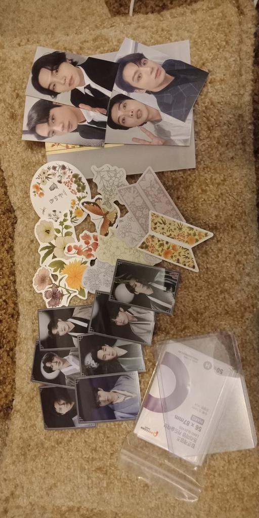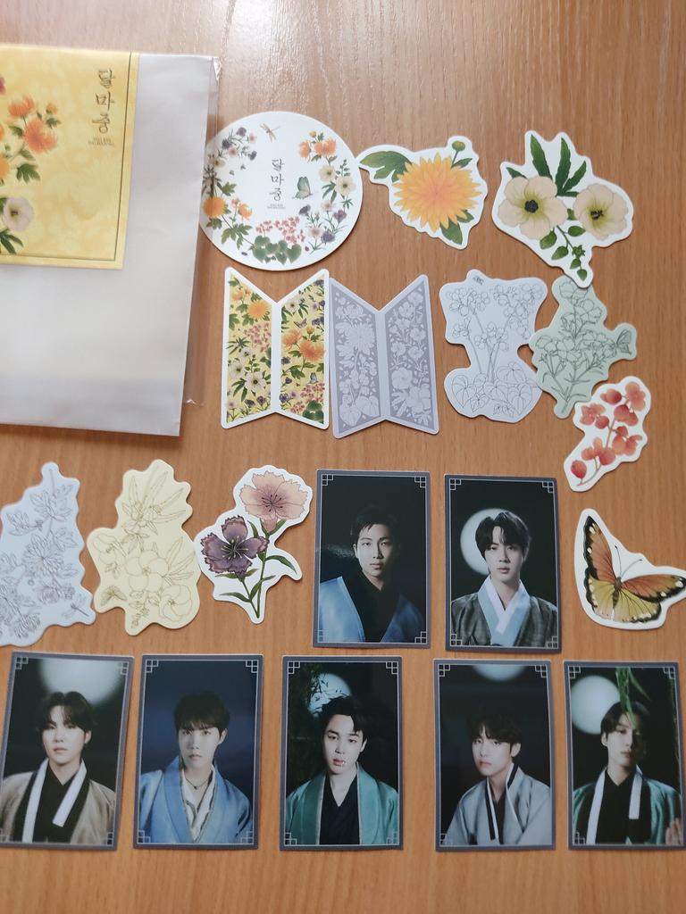Заказ был отправлен 26 июня, поступил в отделение почты 19 июля. Практически не отслеживался. Всё целое, надёжная упаковка. Наклейки, где бантаны в ханбоках, очень красивые. Карточки из другого сета видимо. Очень понравились задники, всё переливается. Тепер нужно подумать, куда их поместить, для обычного биндера крупноваты. В подарок вложили протектор и карточки с Намджуном, Юнги, Хосоком и Чимином.