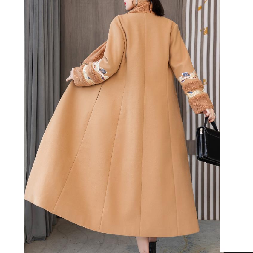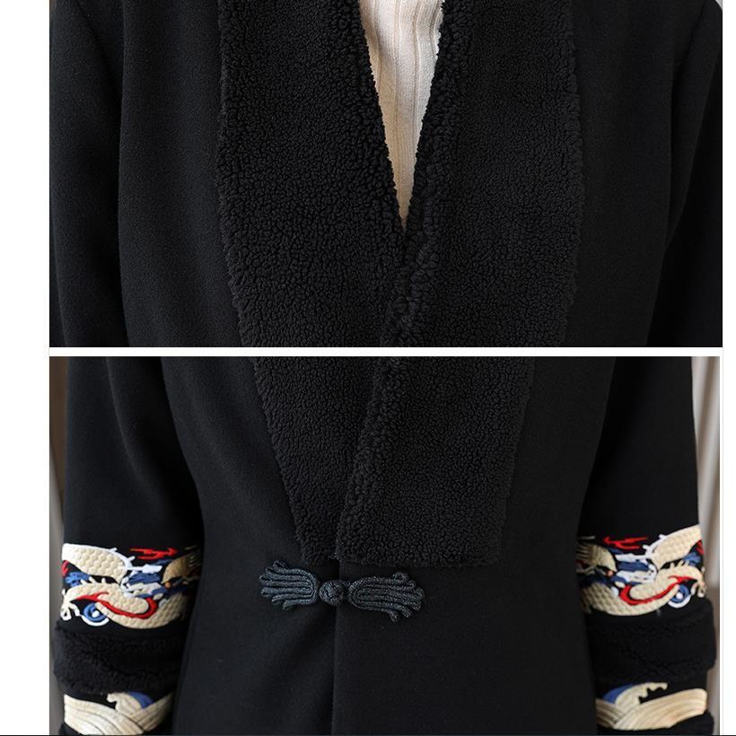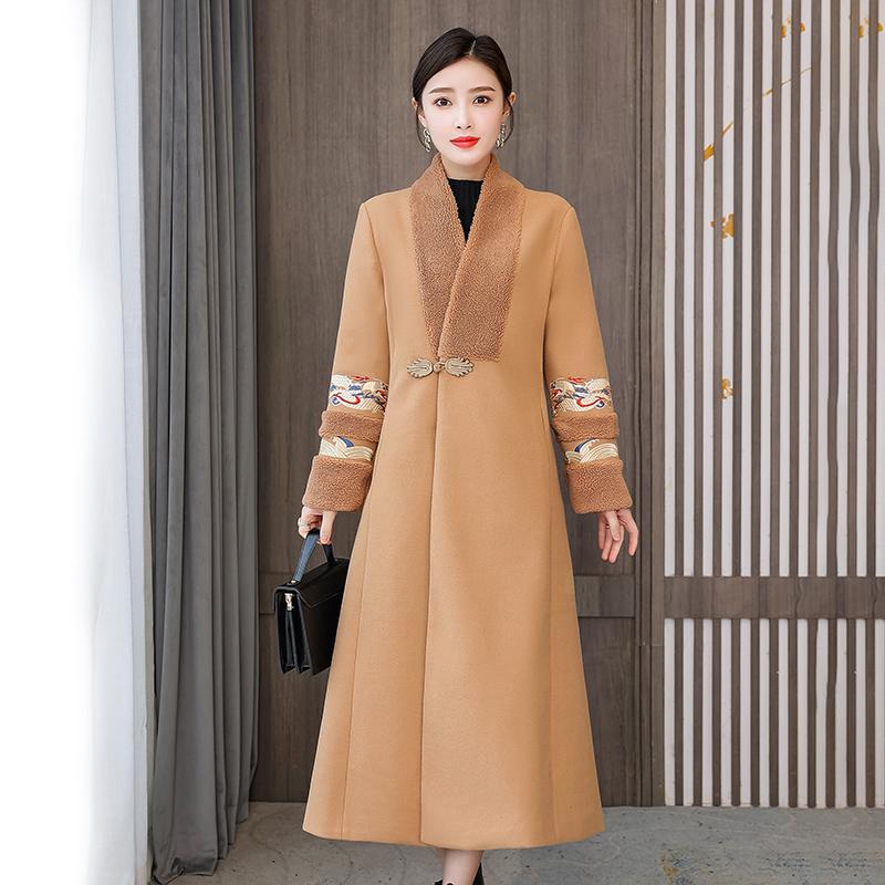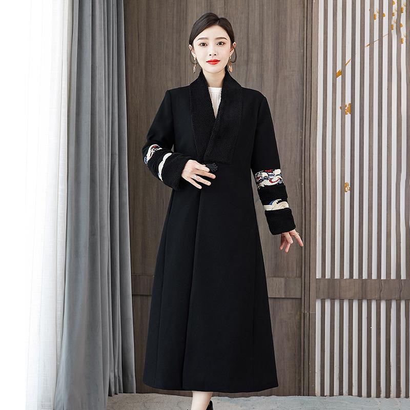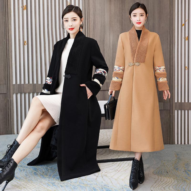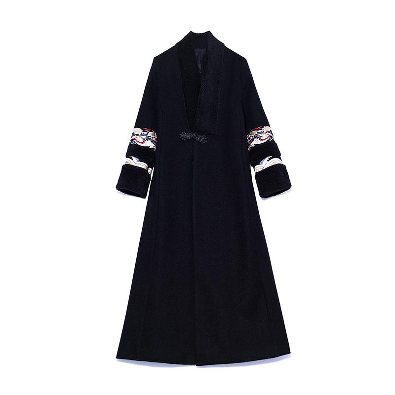 Зимняя мода в стиле ретро с вышивкой в китайском стиле женское длинное шерстяное пальто с v-образным вырезом High Street пальто