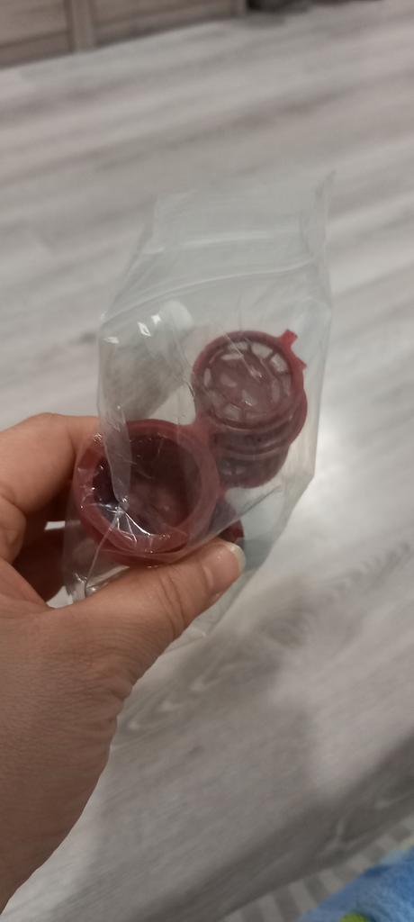 Коричневый стаканчик,все помещается в кофеварку.По результату использования,отпишусь.