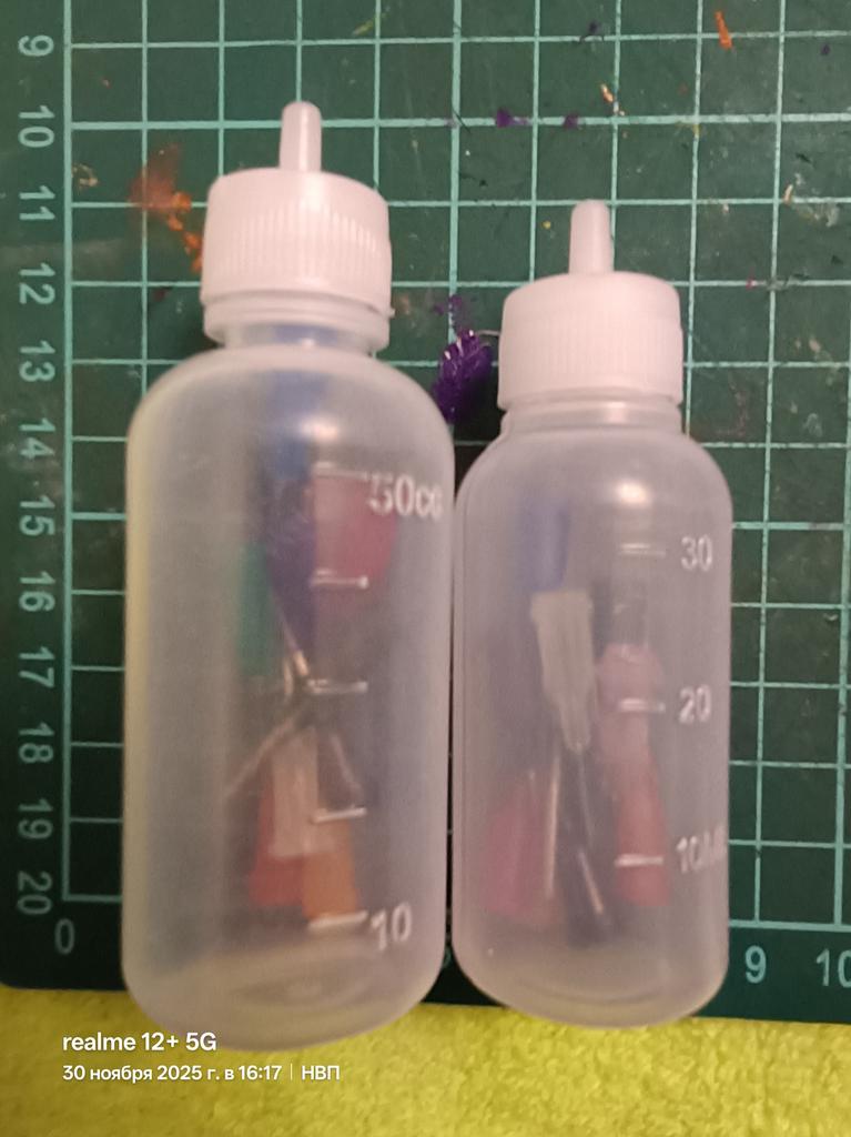 Прозрачный полиэтиленовый дозатор - маслёнка с комплектом (11 шт) капельниц. На колпачок подошли хорошо. 50 мл. Пока довольны покупкой. Всем работникам производства спасибо, спасибо продавцу, Джуму и службам доставки.