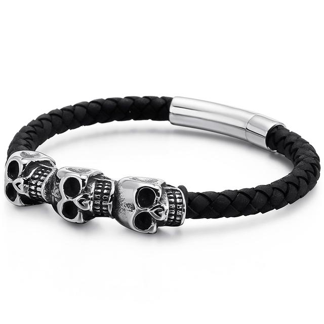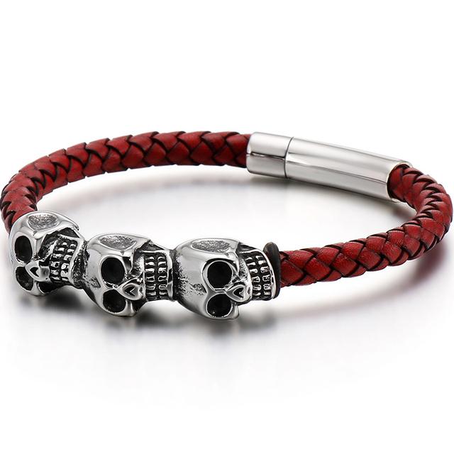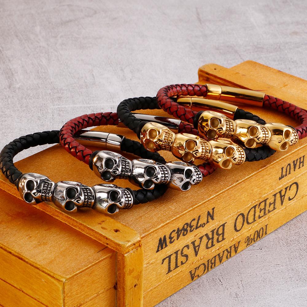 Плетеный черный, красный кожаный браслет для мужчин, мужские браслеты из воловьей кожи, панк-рок, готика, нержавеющая сталь 316L, ювелирные изделия с черепом