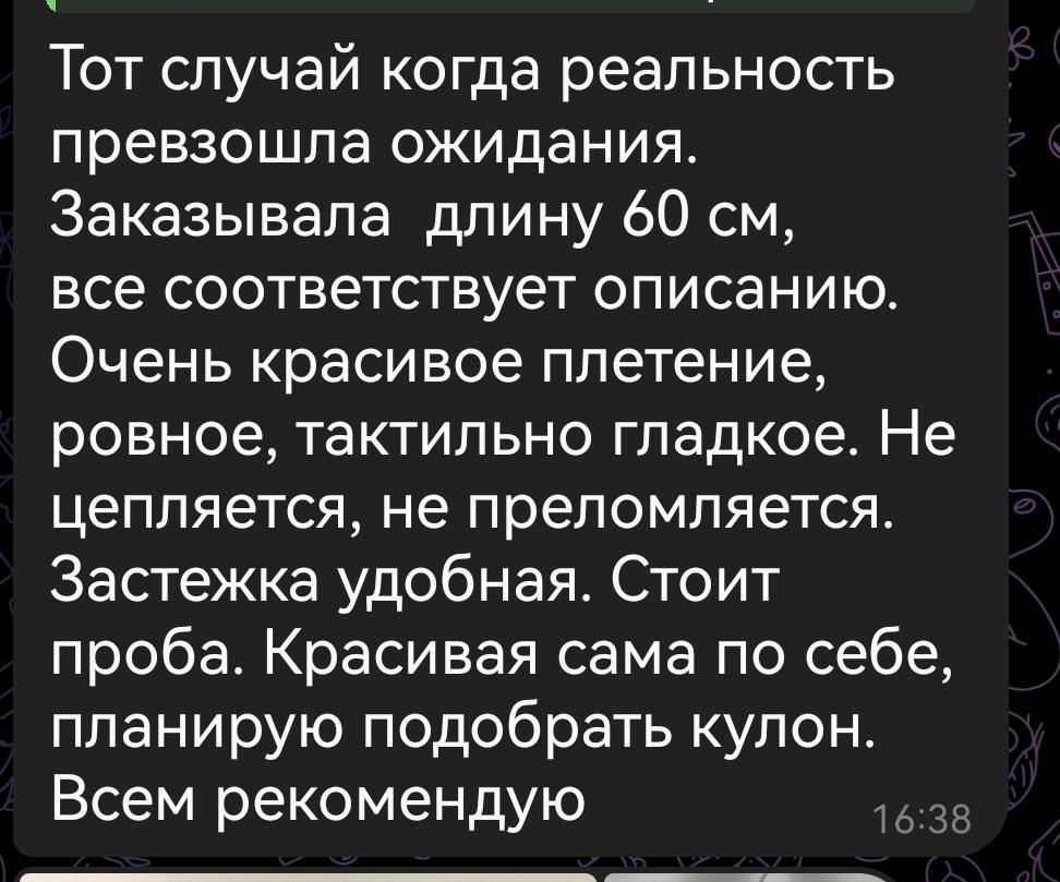 Цепочка очень хорошо выглядит, никаких изъянов нет, замок в порядке, но я сама ошиблась с размером, упакована как из ювелирного магазина. Померила, хоть и коротко, но не как ошейник, может и правильный размер, в итоге всё нравится. Очень надеюсь, она будет надёжной, так на ней буду носить самый дорогой сердцу кулон - иконку. Спасибо 😘