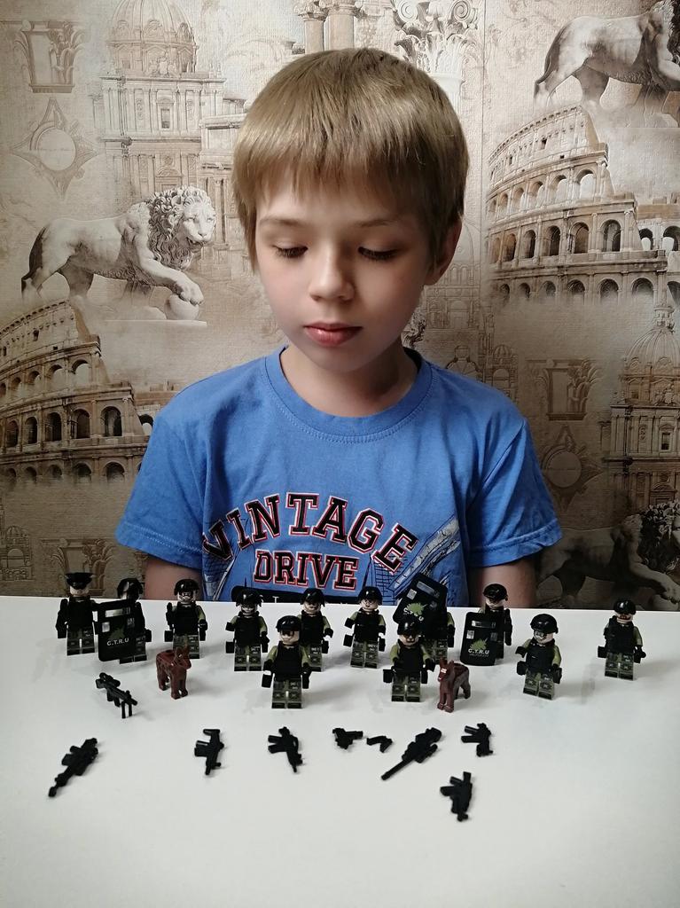 🧩Антитеррористический спецотряд, микрофигурки для конструктора Лего🧩 ☀️Всем солнечный приветик! Племянник увлекается конструкторами и я решила доставить ему небольшую радость и подарить ему в коллекцию антитеррористический спецотряд, пиратов уже подарила! В комплекте 12 фигурок военных и 2 фигурки в виде собак с полным военным боеприпасом, спецоружием! Мы собирали эти фигурки 2 часа, так как незнамо куда прикреплять некоторые детали😂, куда мы их только не прикрепляли! 📦упакована каждая фигурка в отдельный пакетик, все 12 пакетиков упакованы в один большой пакет и пупырчатый почтовый пакет ✈️доставка заняла 1 месяц Качество: 🧩материал - пластик; 🧩хорошая прорисовка деталей, яркие, насыщенные цвета; 🧩ручки, шапочки, отдельные детали, хорошо прикрепляются, очень крепко, когда прикрепляются слышен щелчок; 🧩все детальки хорошо двигаются, гнутся и надёжно прикреплены; 🧩в наборе 12 персонажей; 🧩каждая фигурка военного 4,5 см, собачки по 3 см; 🧩каждый персонаж приходит в отдельном пакете с отделенными ручками и шапочками, военными аксессуарами; 🧩полная комплектация. Племянник просто скачет от восторга🤗! Спасибо большое продавцу и любимому Joom🛍! Товар и продавца однозначно рекомендую всеми ручками 👍🏼! Всем приятных и радостных покупок💋!