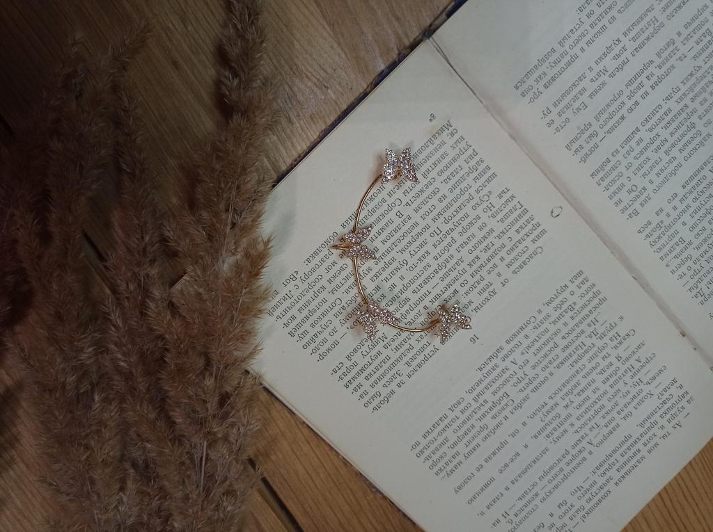 Кафф с бабочками Есть на левое ушко, а есть на правое, на выбор. Стразы сверкают при хорошем освещении. Его только нужно подогнать под ваше ушко. Есть в серебряном цвете и в золотом. Доставлен в зиппакете в почтовое отделение за месяц живым треком в сборной посылке.