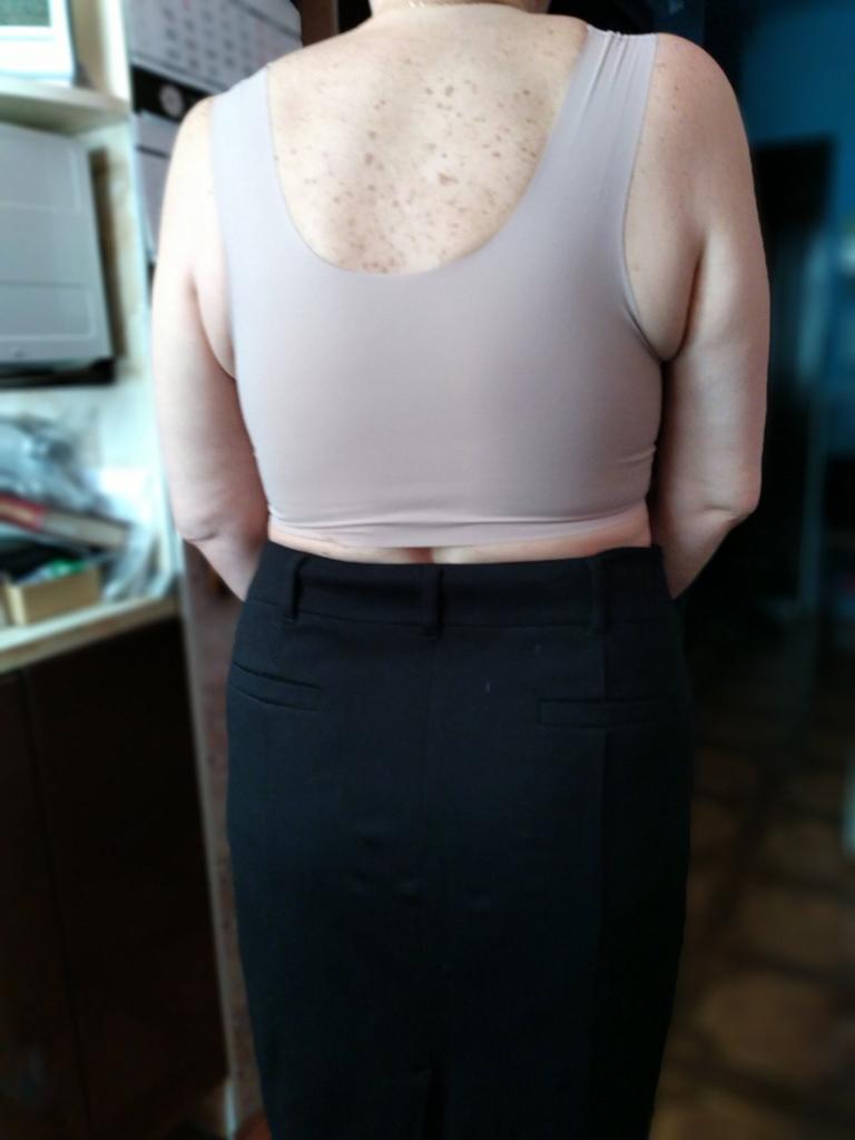 Ношу 46-48 размер, размер чашки 3, подошел хорошо. Широкие брительки, нет застежек, как топик, задняя часть и брительки из лёгкого трикотажа, чашечки кружевные, очень тонкое кружево, форма чашек красивая, не давит и не впивается, очень довольна! Закажу ещё другой цвет
