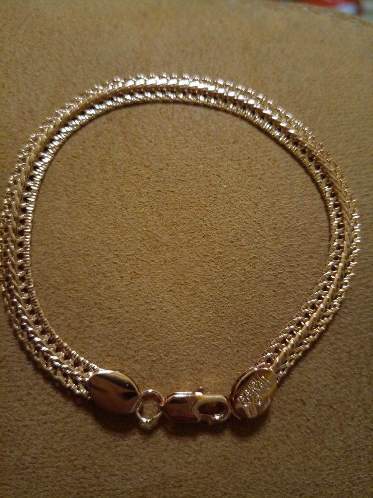 Заказала браслет . плетение красивое. Качественный.Но на мой взгляд с образцом на фото отличается. Судя по фото изделие выглядит гибким и более крупным. На самом деле он более жёсткий и мелкий. На вид не могу сказать , что выглядит прям как золото, цвет под красное золото. По весу легкий, на весах показывает 9 грамм. По размеру подошел. Немного разочарована. Но поношу конечно, посмотрю как проявит себя в носке. Доставка во время.