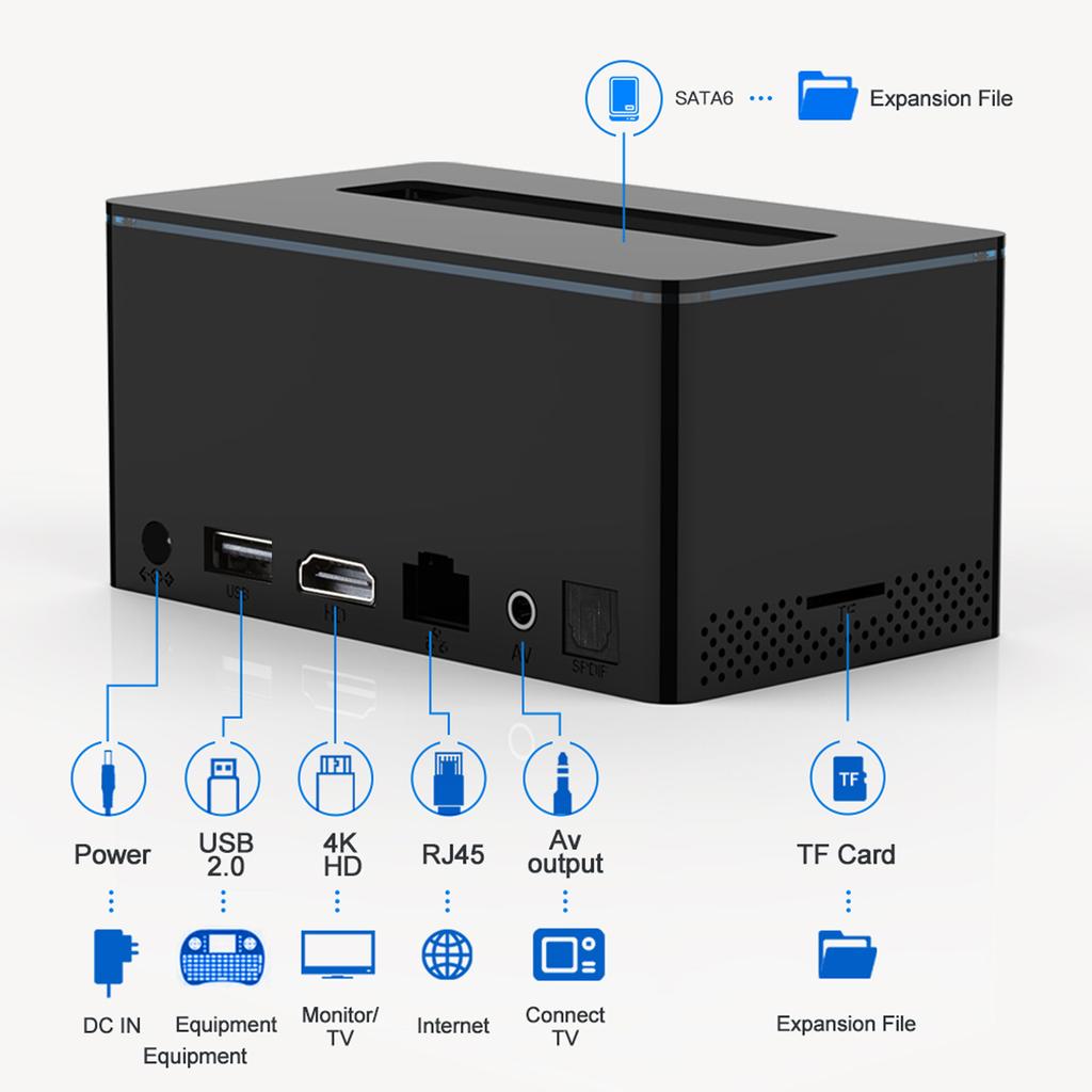 Интерфейсы ввода/вывода: 1 * HD-выход, 1 * AV-выход, 1 * USB 2.0, 1 * слот для карты TF, 1 * RJ45, 1 * DC IN, 1 * слот SATA6, 1 * SPDIF